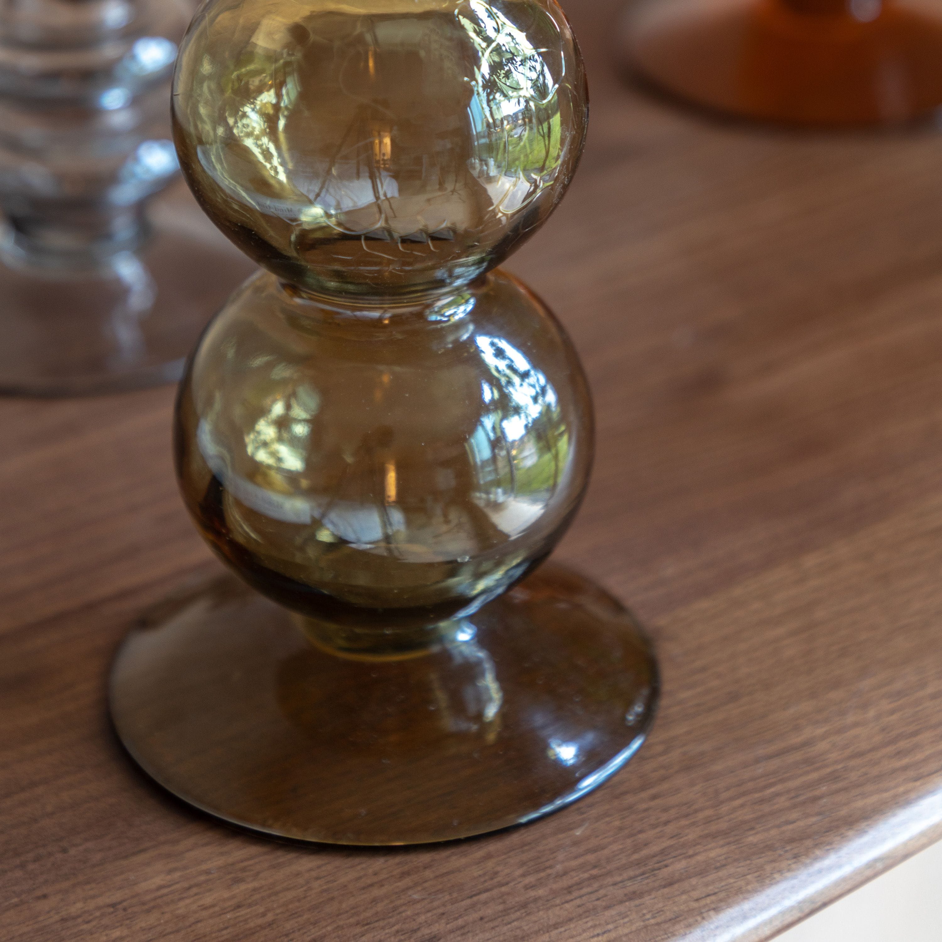 Update your interior with these mid century inspired candlestick. The warm amber glass and bobble shaping makes it the perfect piece to dress up your mantle or table.