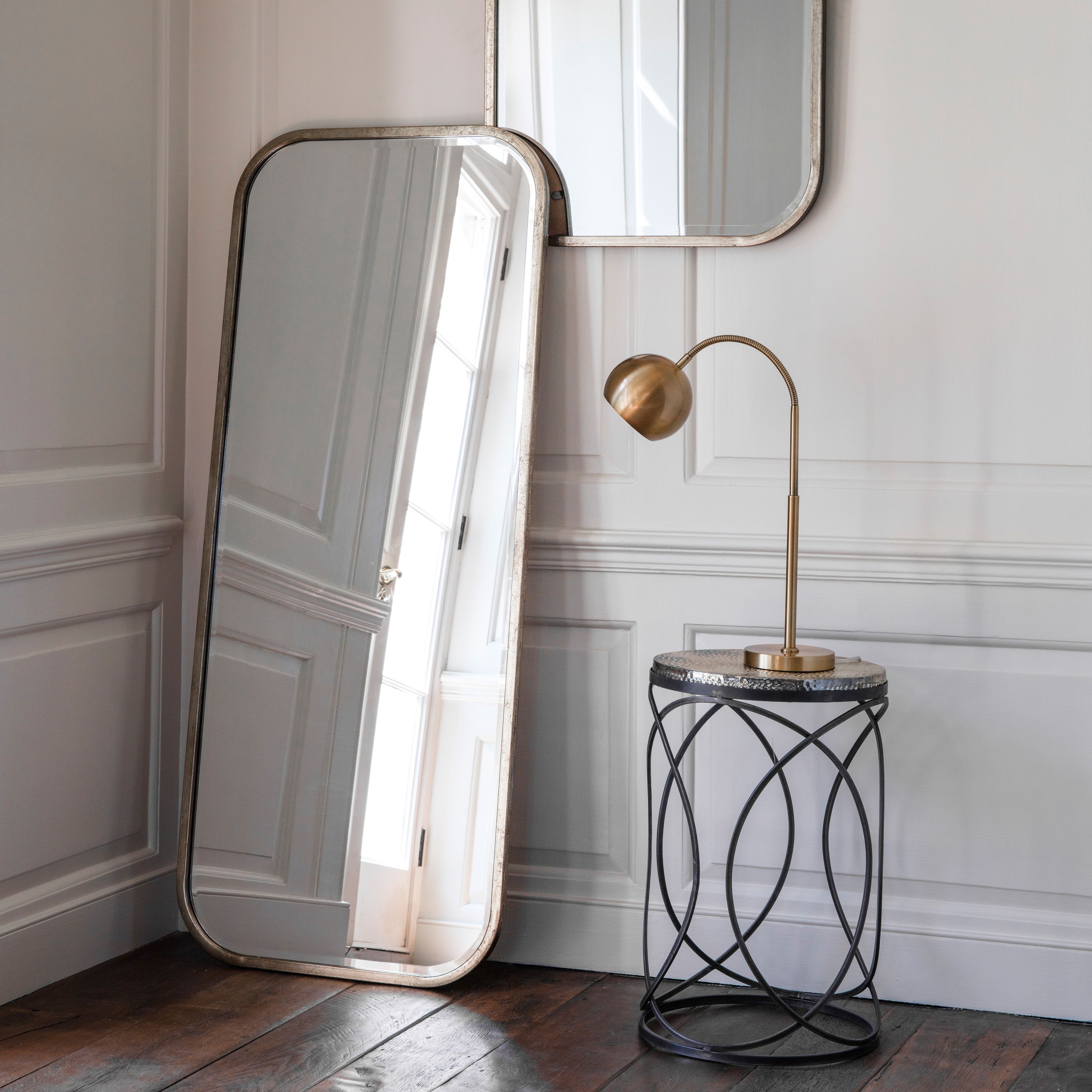 Contemporary wall mirror featuring simple curved corners in a distressed champagne finish.