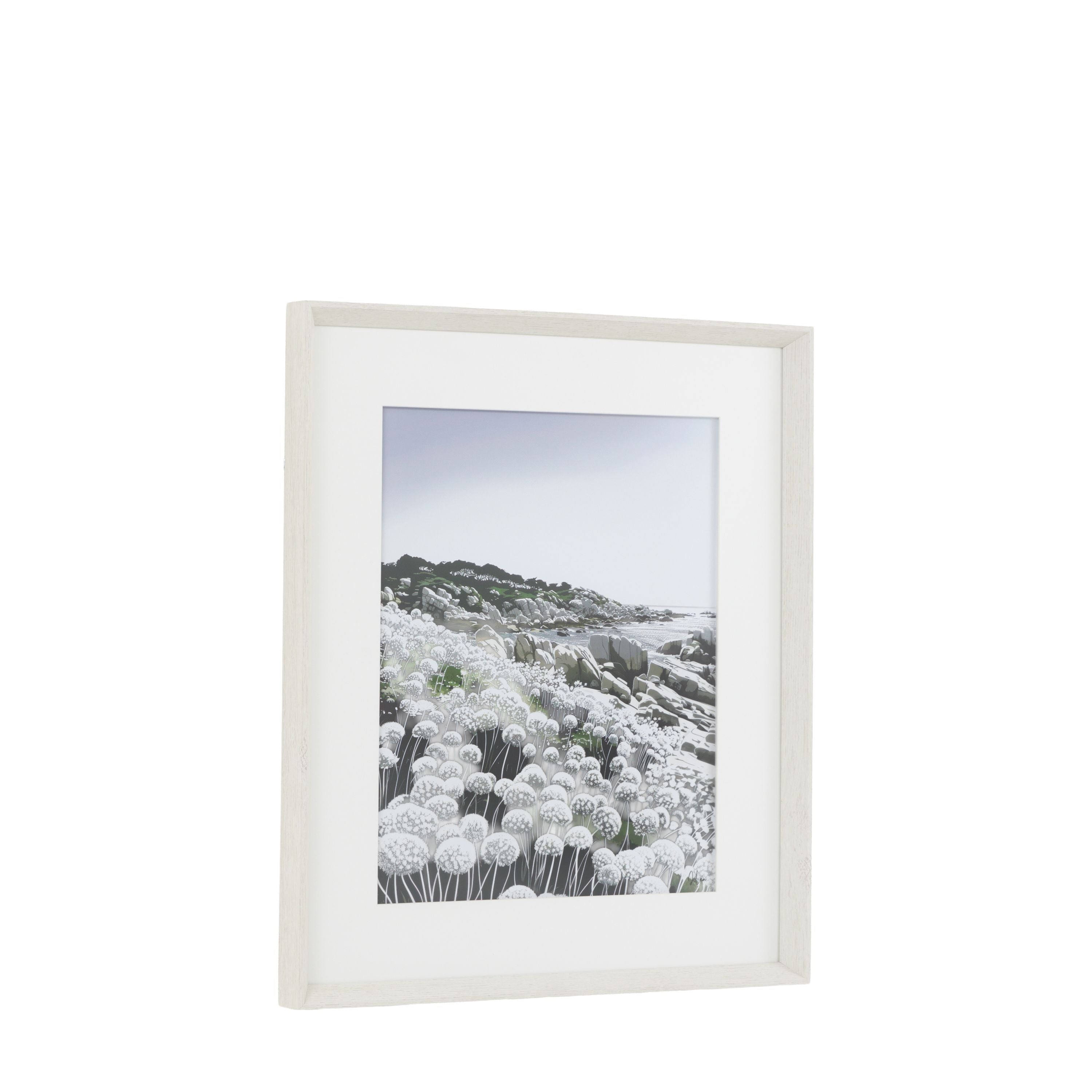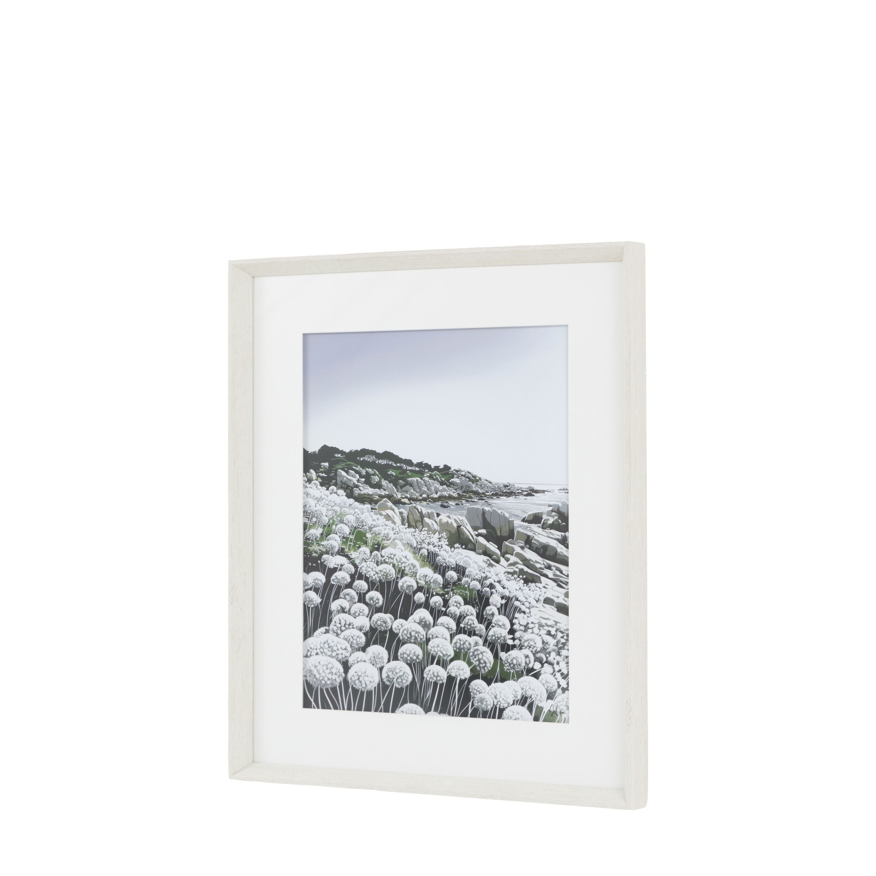A striking seaside scene depicting a coastal hillside covered in wildflowers. The detailed textures and soft tonal contrasts evoke calm and natural beauty. Framed in a white-washed oak finish, this piece combines modern simplicity with organic charm, making it an elegant addition to both contemporary and nature inspired interiors.