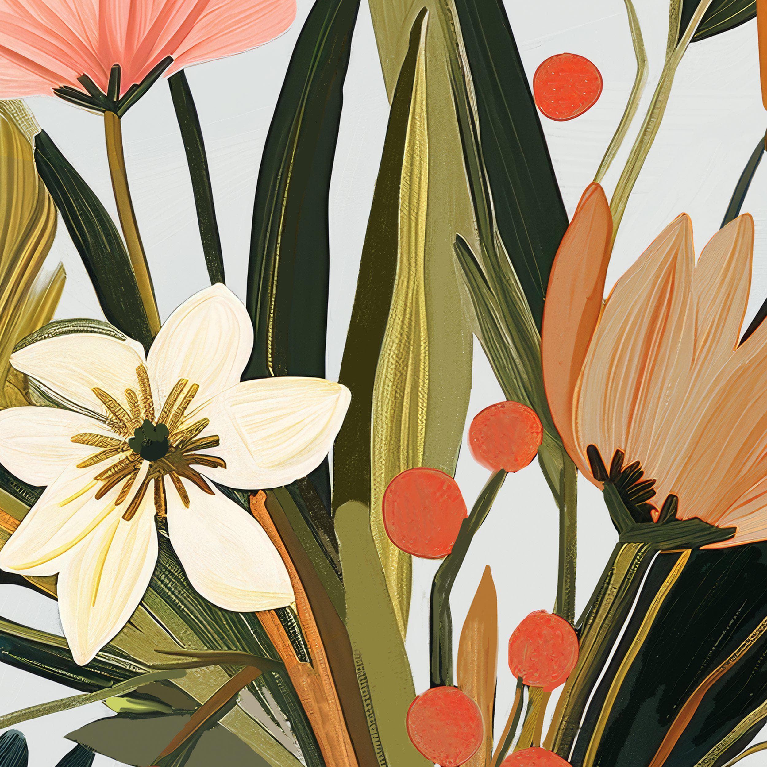 Exuding a mid-century style, a delightful floral arrangement graces an everyday vase. The bold colours and shapes of the blooms and berries create a vibrant display. A stack of earthy books, meticulously arranged, adds a sense of order and balance to the scene, symbolizing an organic life. Joanne Lea's vintage-inspired wall art, printed on canvas and framed with a wood effect finish, adds a nostalgic touch.