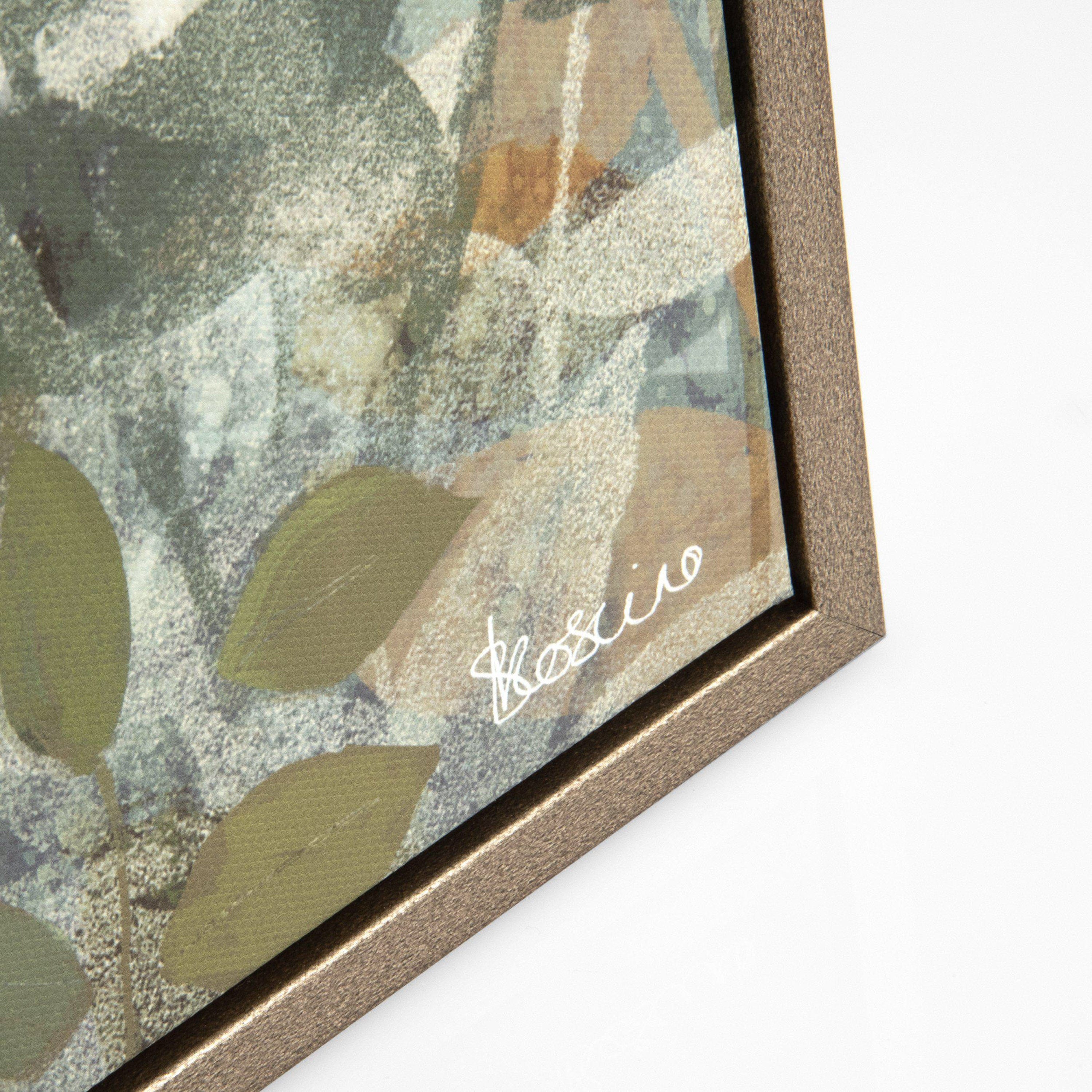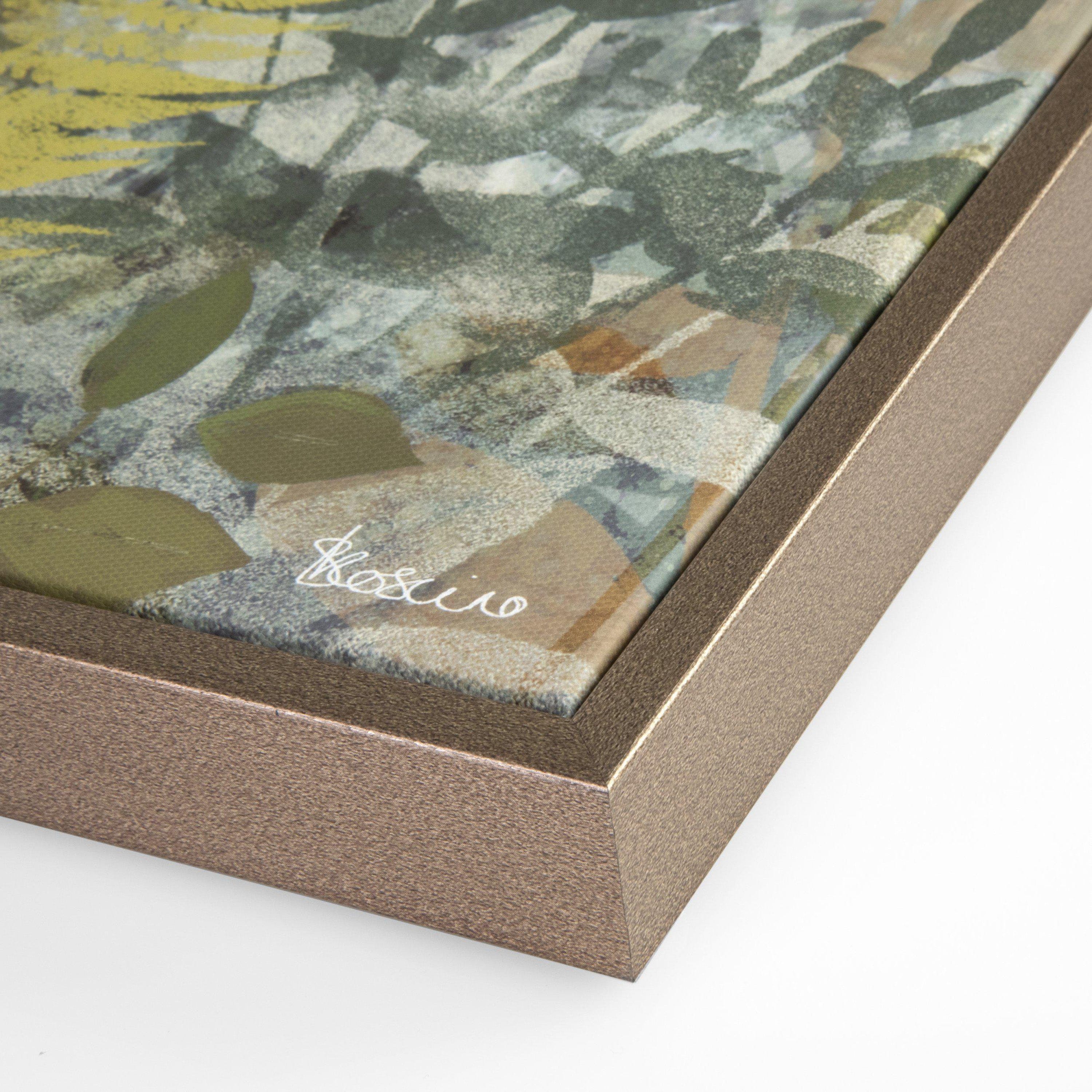 Wildflowers, ferns and frost-kissed foliage scatter themselves amongst a dense hedgerow. Illustrated in invigorating greens and browns, Sabrina Roscino captures the essence of the countryside as Winter yields to Spring. It is a stunning, classic landscape with a contemporary soul. Completing the design is a slimline mottled gold flush frame.