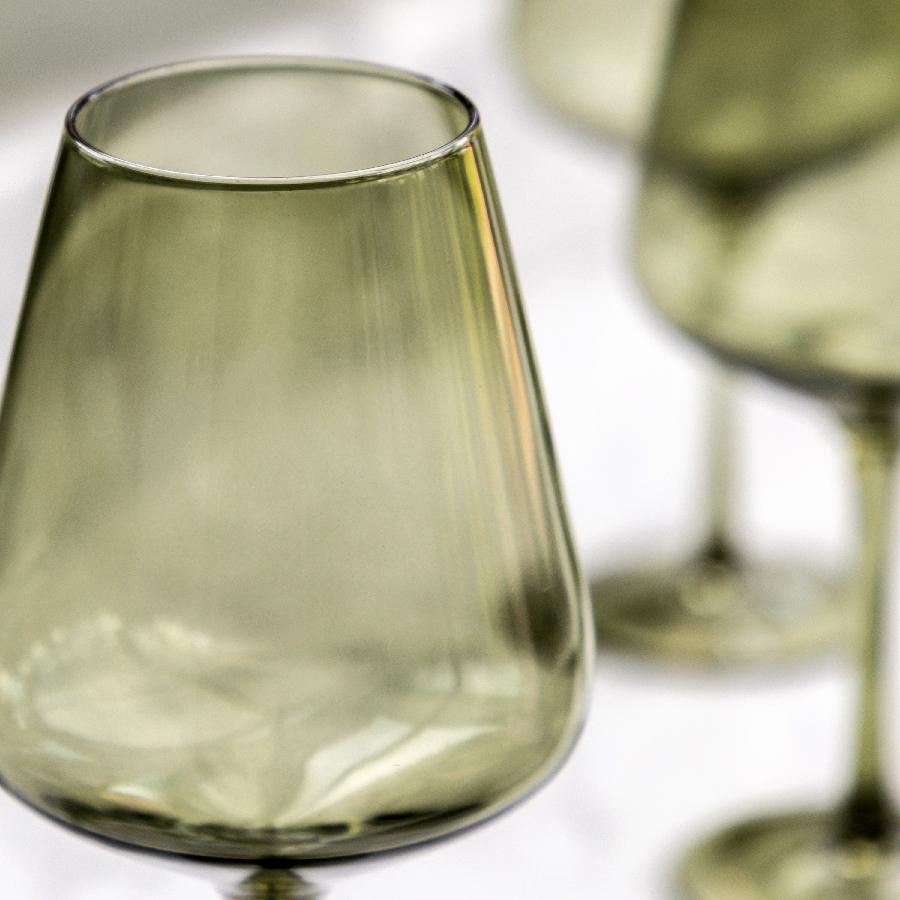 In smokey green glass this elegant set of 4 wine glasses features slender stems and angled bowls, creating a sophisticated glass perfect for enjoying a glass of wine in style.