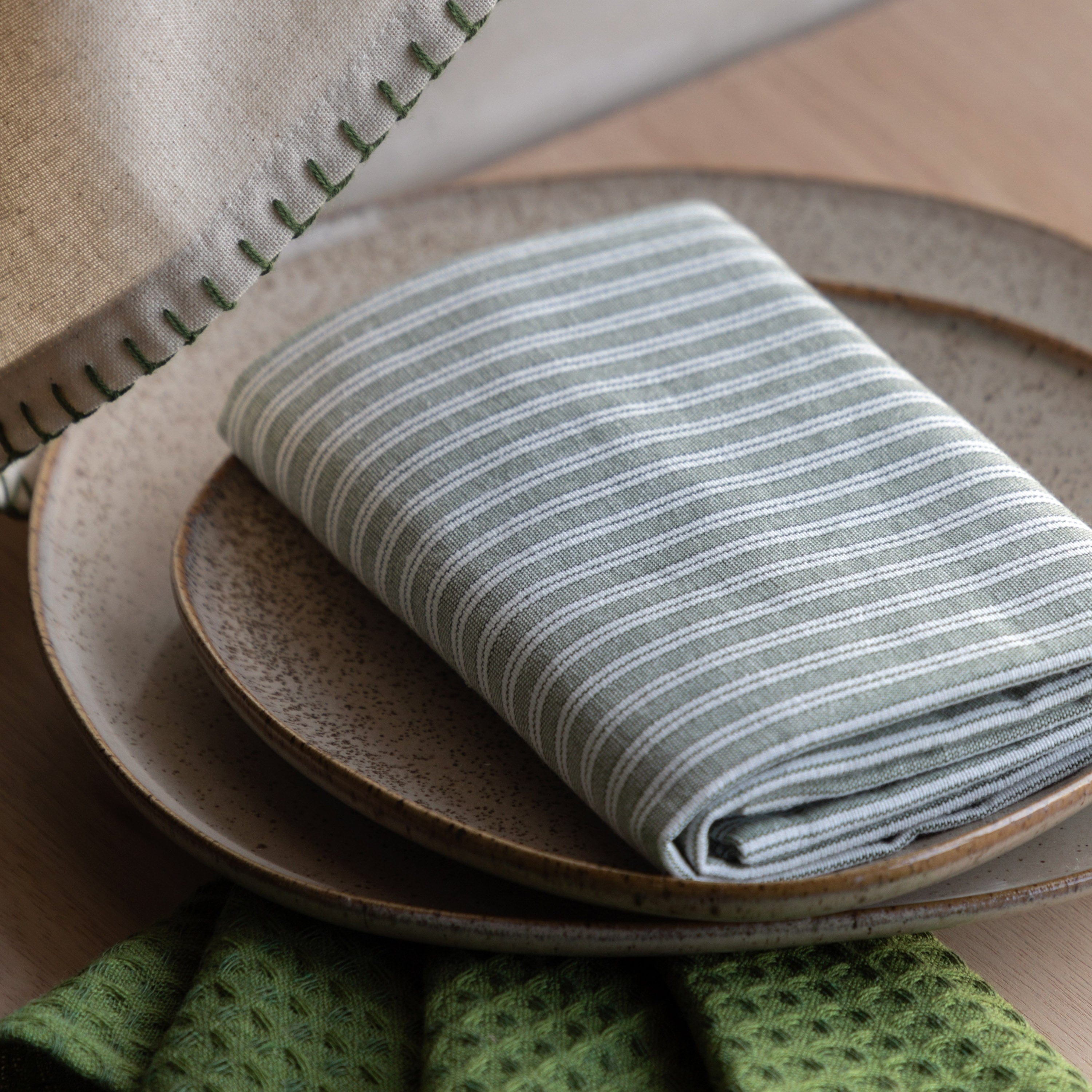 With a touch of the traditional, this set of 3 tea towels will tie together your festive theme, embroidered with a mistletoe to design, green stripe and plain dark green.