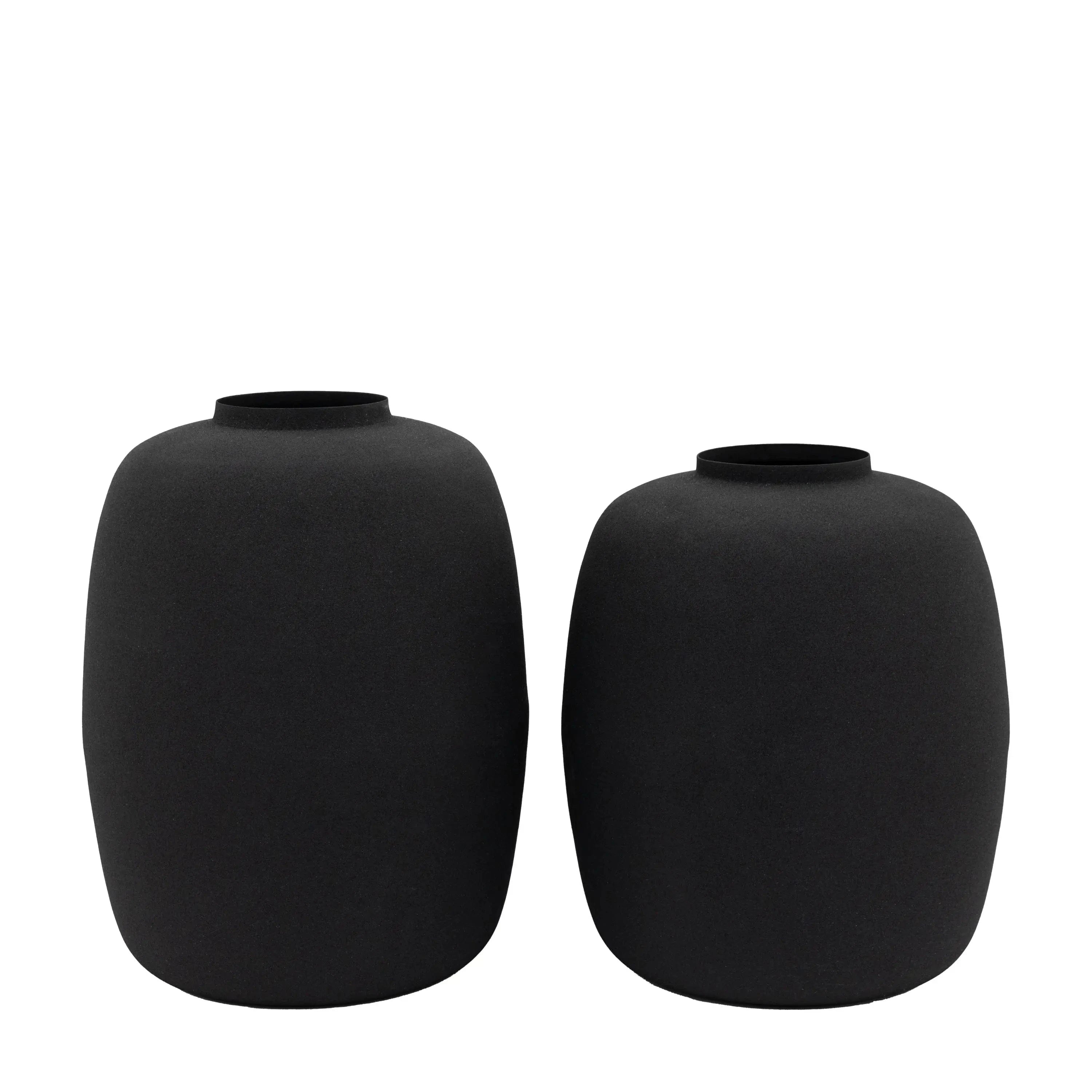 Introducing the Zila Vase Black Set of 2, a must-have addition to any minimalist home. These spun metal vases feature a sleek matt black textured coating, adding a touch of sophistication to any room. Whether displayed alone or paired with dried or faux floral, these vases are sure to make a statement.