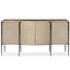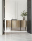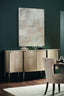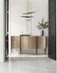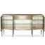 Give your room endless character by incorporating this shapely, shimmering cabinet in your design plan. Serpentine in shape, it boasts an intriguing mix of materials and features extraordinary curved glass doors crafted with a textured pattern on the inside. Metal posts and hardware finished in plated Deep Bronze add contrast to its Taupe Paint and Soft Silver Paint exterior. Ideal in the dining room or living room, this stunning design casts a warm metallic glow when bathed in light. Case finished in Taupe Paint. Textured pattern on back of the curved door glass. Four curved glass doors with touch latch. Metal posts and hardware finished in plated Deep Bronze. One drawer behind center doors and adjustable glass shelves behind outside doors. Interior drawer features felt covered silver tray. Interior in Taupe Paint.