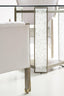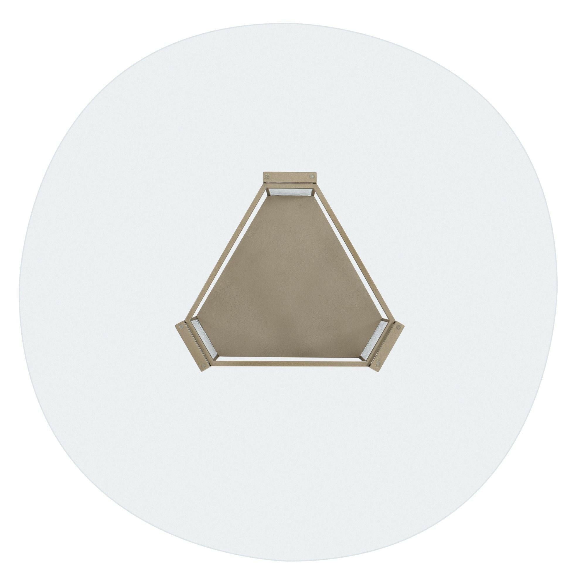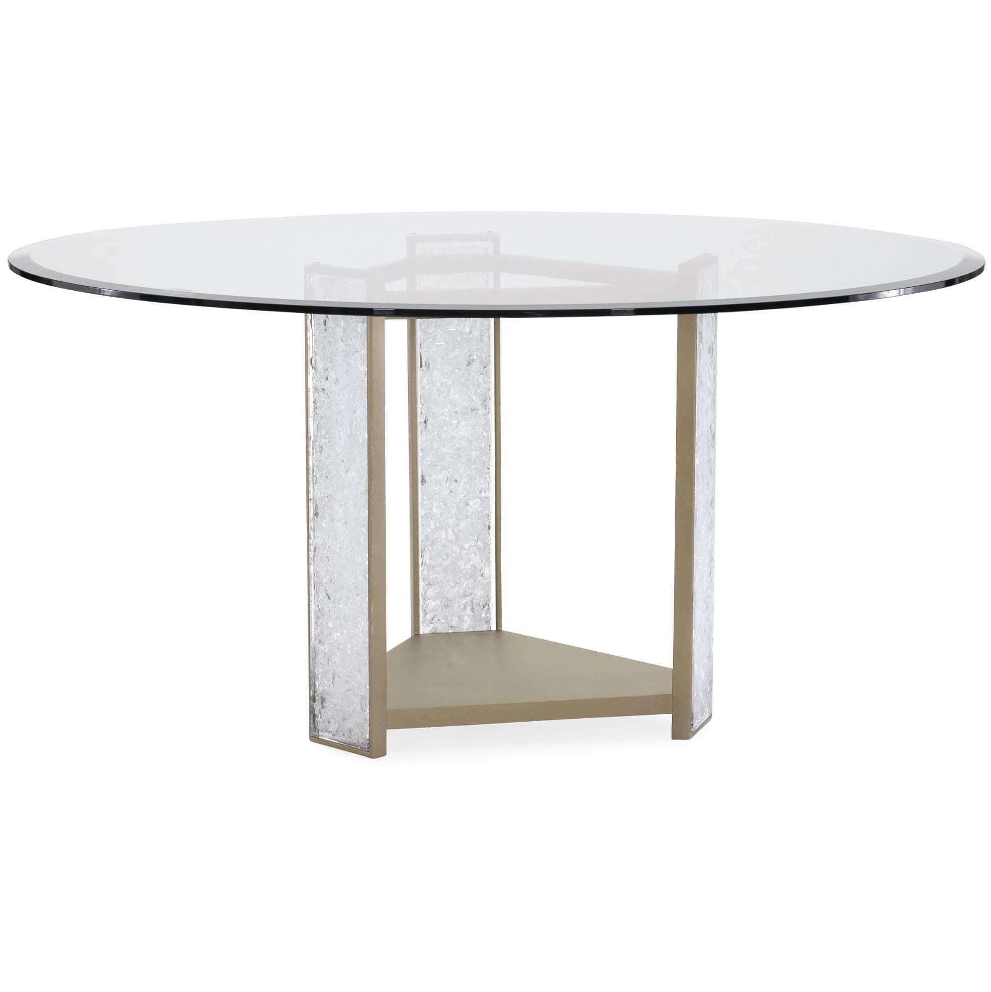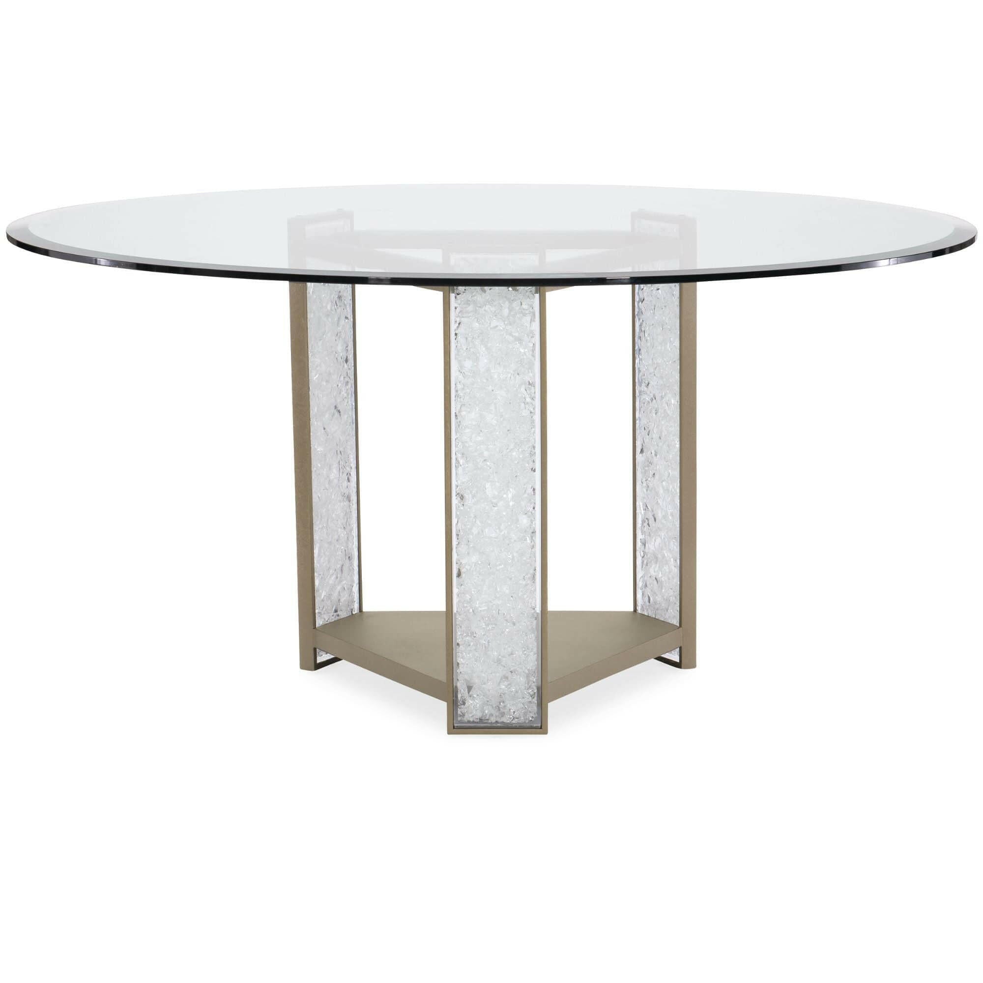 Meet our new crush: Break the Ice. This amazing dining table defines unboring. Its open triangular base features three rectangular pillars crafted of crushed crystals encased in clear acrylic. A Brushed Sundance Gold finish outlines the pedestal and each pillar to create a jewel-like presentation that catches the light and offers continuous sparkle and shine. A 60-inch round glass top with 5/8 inch bevel ensures the glamour of this distinctive design can be seen from everywhere in the room. Pedestal is finished in Brushed Sundance Gold. Pedestal legs have strips with cast acrylic broken crystals. 60" round, 5/8" thick glass top.
