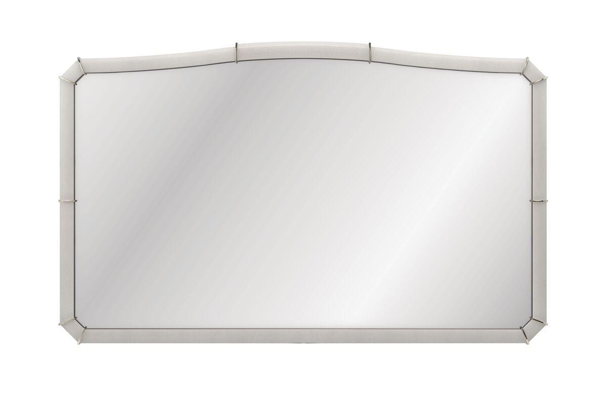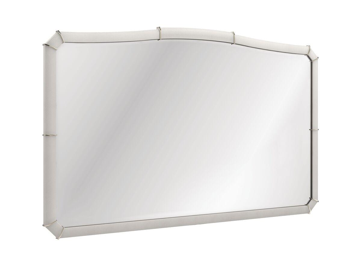 Wrapped in an elegant, Alabaster-painted faux shagreen, the Aria mirror introduces a note of refinement in any interior. Features a softly curving arch along the top, with a beautiful beveled edge for added reflection and metal inlays in a Whisper of Gold. Perfectly sized to hang above a dining room buffet, hallway console or dresser.Frame wrapped in Alabaster painted Faux Shagreen. Metal corner inlay in Whisper of Gold. 1.25 in beveled mirror.