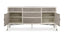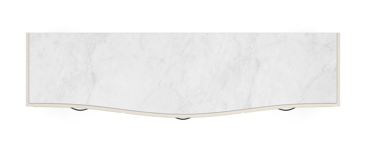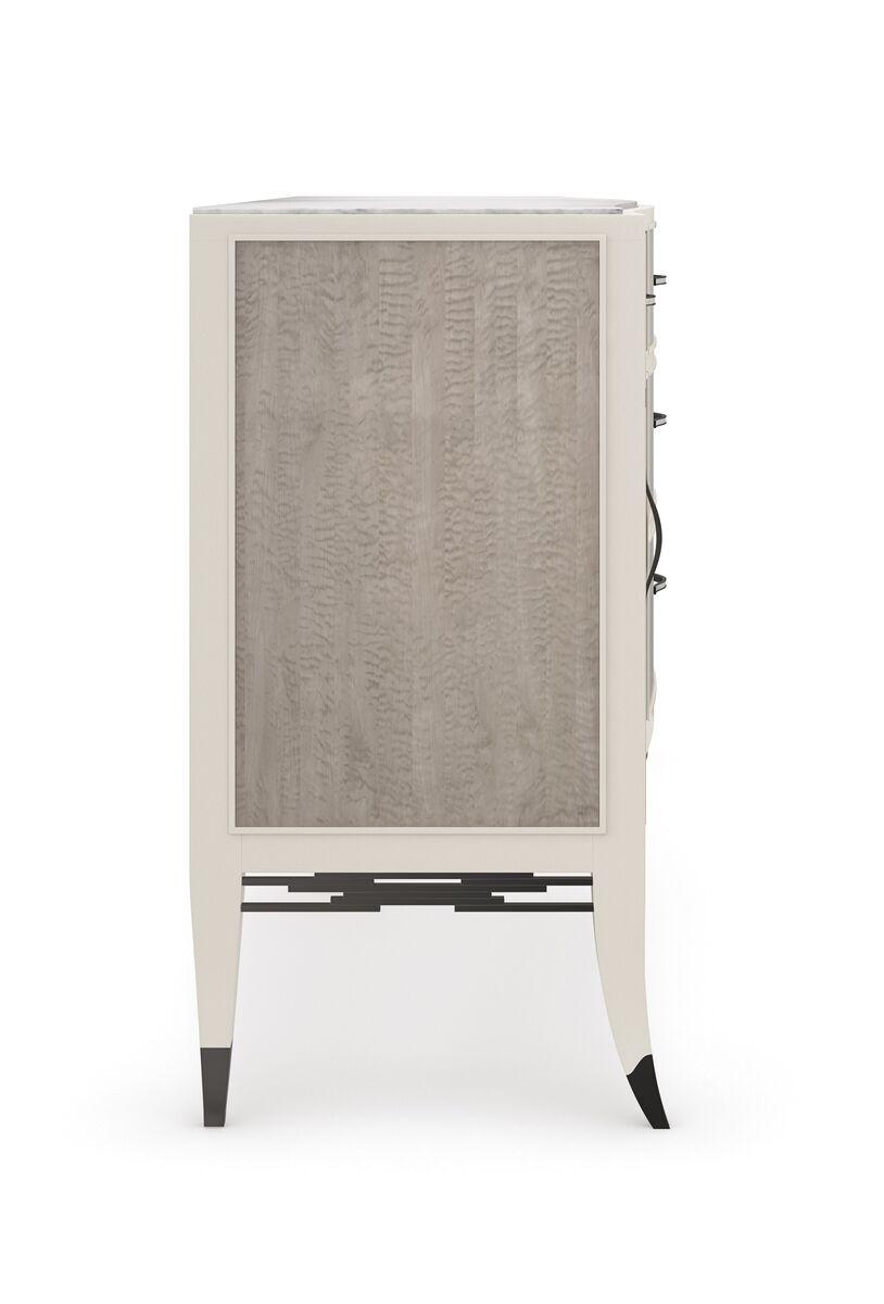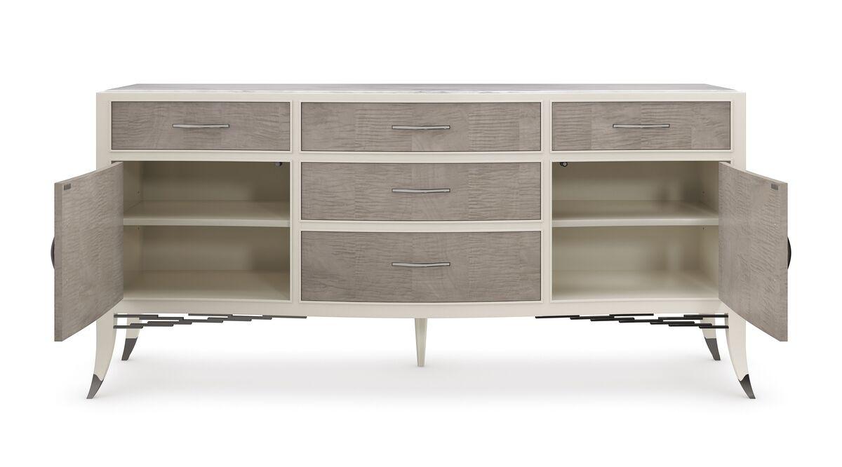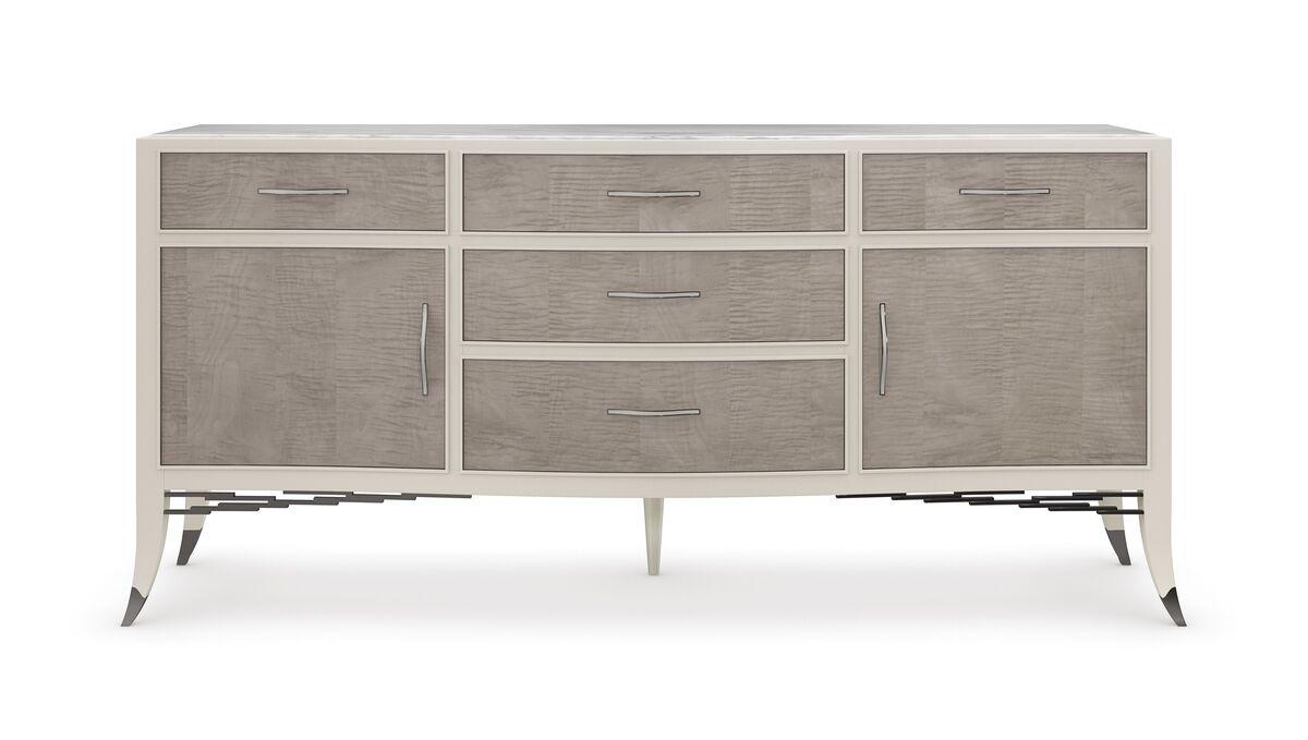 A beautifully figured wood grain lends a natural embellishment to this contemporary buffet, crafted in a modest yet memorable mix of materials and finishes. Linear drawer pulls create a sense of repetition, with a subtle arching curve and faux shagreen inlay. Adding to its subtle flare: stacked metal fretwork beneath the base and decorative ferrules in a Deep Bronze finish. Offers ample storage for serveware, linens, and other entertaining essentials. Supreme white marble top. Case in Crème de la Crème. Two doors with fronts in Chinchilla with interior adjustable shelves. Five drawers with fronts in Chinchilla with side guides. Metal ferrules and bottom fret work in Deep Bronze. Interior in Crème de la Crème. Drawer interior in UV Linen. Hardware is bar pull in Deep Bronze with Shagreen inlay.