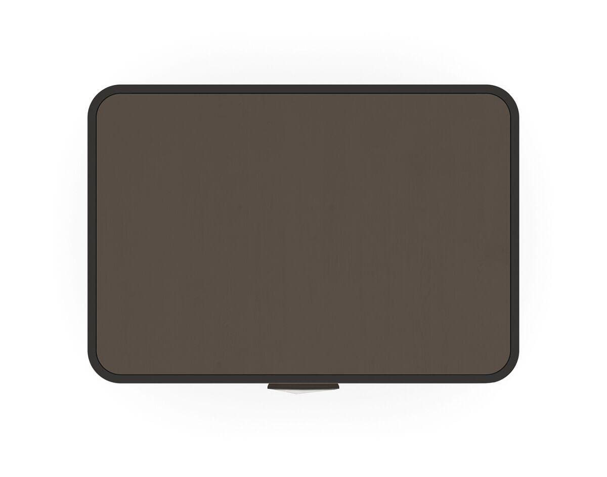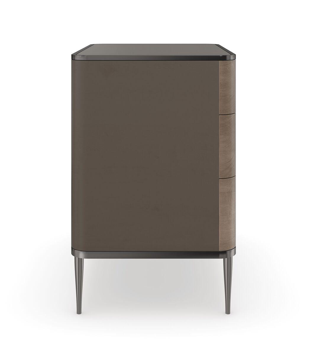 Measuring 66 cm in width, 45.7 cm in depth, and 71.1 cm in height, this bedside companion is both functional and visually appealing. It features three drawers with a radial veneer pattern finished in Mocha and soft close side guides. The metal bottom frame and legs in Deep Bronze add a modern touch to the overall design. The drawer interior is finished in UV Chocolate, adding to the luxurious feel of this piece.