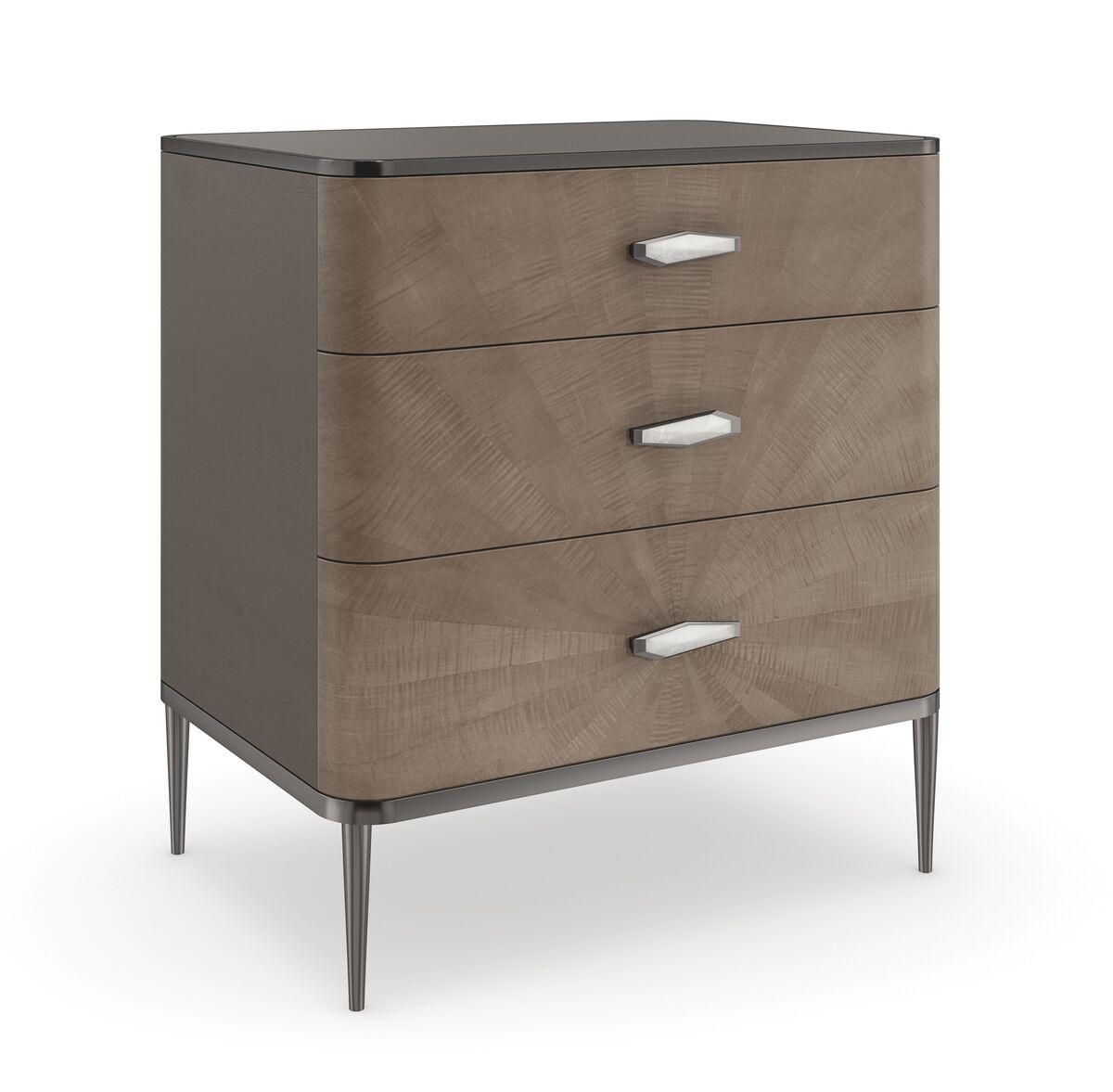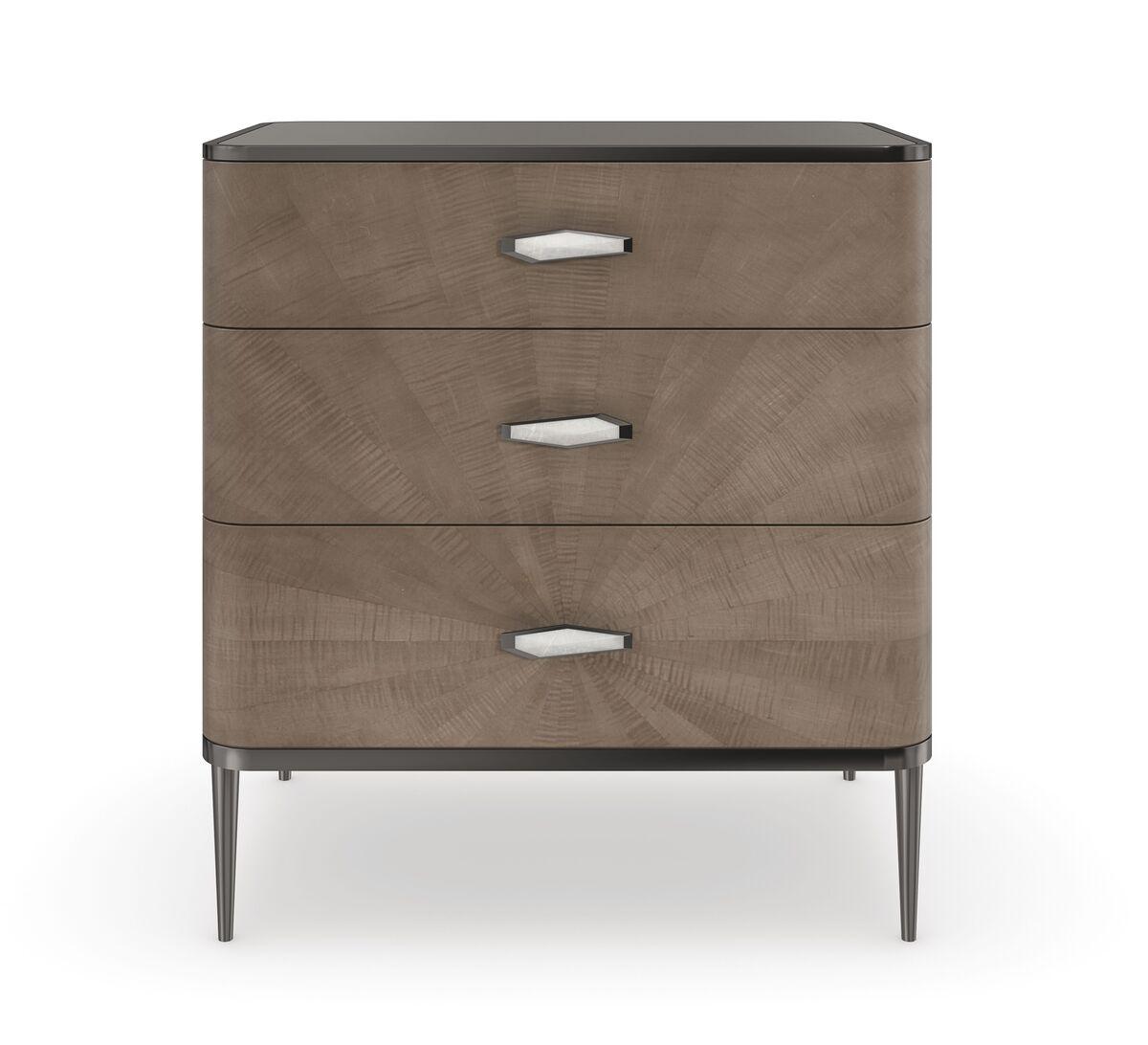 The Caracole Classic - Spectrum is a truly unique piece of furniture that will add a touch of luxury to any bedroom. Made from Chocolate Tiger Maple, this nightstand features a stunning double starburst-patterned veneer that radiates up and outward from its bottom drawers. The soft, rounded edges give it a refined and organic look, while the Galaxy Bronze finish and Deep Bronze metal frame add a touch of elegance. The painted drawer interiors and faceted ivory resin hardware encased in Deep Bronze metal make for a distinctive finishing touch.