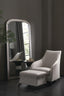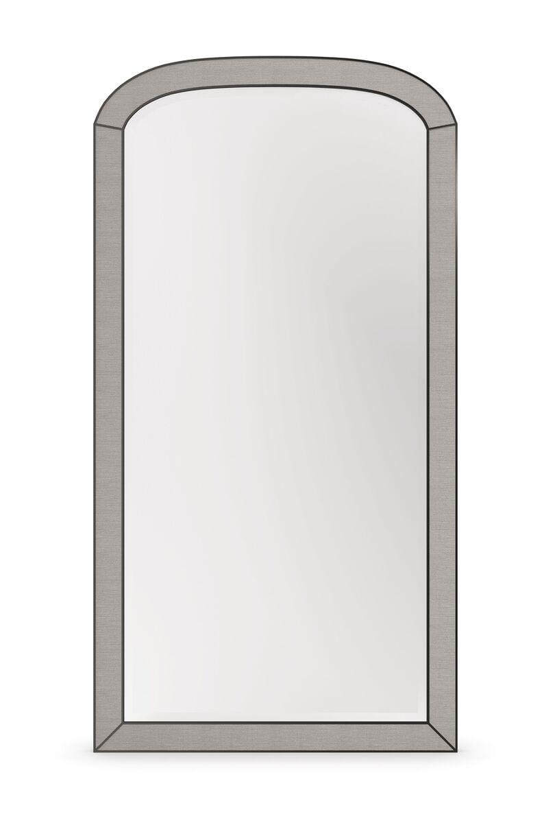 Elevate the view in any room with this beveled floor mirror, designed to prop against the wall or hang for added drama. Illuminating its eyebrow-arched shape: a panel of Sun-kissed Silver raffia, delicately trimmed in Deep Bronze metal. Style solo, or in multiples to evoke the aesthetic of a Greek colonnade.Metal frame in Deep Bronze. Inset panel wrapped in Sunkissed Silver. Clear mirror, 1 inch bevel