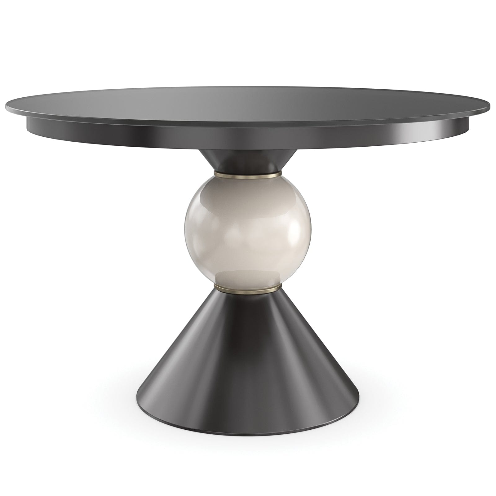Chalice Dining TablePerfect for intimate dining and smaller-scale settings, this classic round table draws attention with a simple yet sculptural base. A black glass top adds depth and reflection, beautifully balanced by a ceramic ball detail finished in a pearlescent glaze. Brushed Gold metal beading adds a hint of shimmer and sophisticated adornment.FEATURES:Top is 48 in round black glass.Top wood frame in Almost Black.Base in Almost Black with metal bead in Brush Gold.Base center with porcelain decorative ball in Shellish White.Caracole ClassicTaking the classics of furniture design and pairing with unique materials and refined finishes, this portfolio was born of our vision to create high-style furniture with a personality of elegance and individuality. Bring a breath of fresh air to interiors with distinctive pieces for every room of the home, while blurring the lines between classical styling and modern taste. These playfully named pieces address whole room environments through an eclectic lifestyle approach, instilling a scheme with versatile furniture that are sophisticated, creative and classy in equal measure.