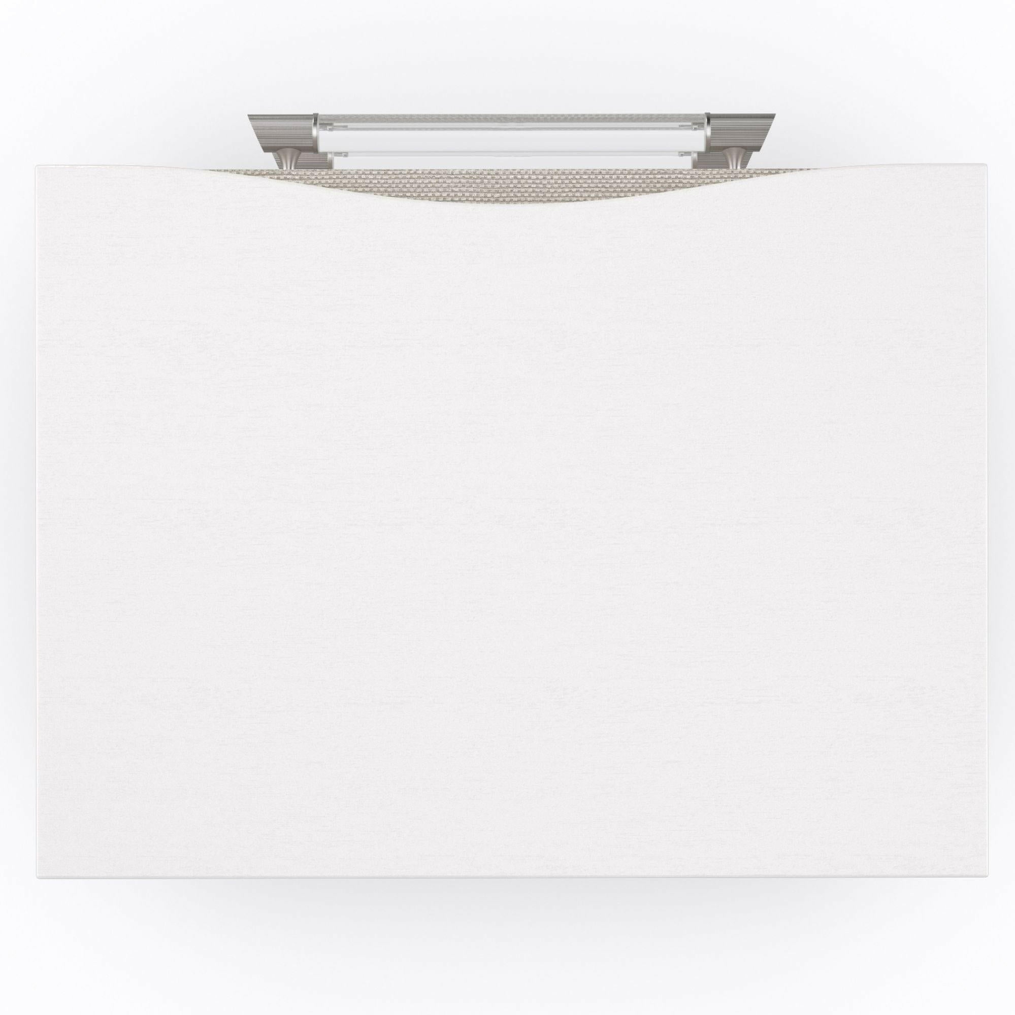 This elegant bedside table introduces a softly textured, metallic element with inherent organic character. Woven raffia drawer fronts are reimagined in Sun-kissed Silver, complemented by ash veneers in a Pearly White finish. For a distinctive finishing touch: clear acrylic drawer handles are capped in ribbed stainless steel. Features a USB port on the back for convenient charging and cut-outs for wire management. Case in Pearly White. Three drawers with raffia fronts in Sun-kissed Silver and soft close undermount guides. Drawer interior in Pearly White. Wire management holes in back panel. USB port