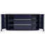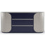 A high-fashion design with a sophisticated profile, this oval-shaped dresser introduces an Italian modern aesthetic and a bold pop of colour to bedroom interiors. Painted drawer fronts in a Prussian Blue hue add depth to its sleek and simple form, accentuated by subtly curved doors in a Thunder finished veneer. Offers abundant storage with three soft-close drawers and two adjustable shelves behind each door. Case in Thunder. Three drawers with fronts in Prussian Blue Paint with soft close undermount drawer guides. Two doors with two adjustable shelves behind each door. Plinth base in Prussian Blue Paint. Door interior in Prussian Blue Paint. Drawer interior in cream paint.