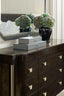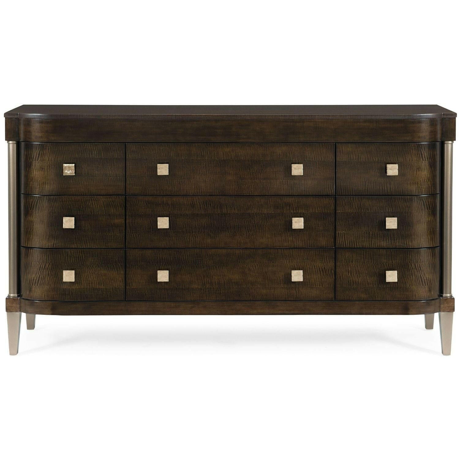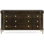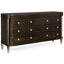 The Dramatic Presence Bedroom Dresser from House of Isabella is a truly unique piece of furniture that will add a touch of sophistication to any bedroom or dining room. Made from Dark Roast Figured Maple, this triple dresser features a streamlined front with generously curving drawers on each end. The smooth columns are bathed in Harvest Bronze, adding a luxurious touch to the overall design. The dresser stands on smooth tapered feet, also accented in Harvest Bronze. The lustrous gold square pulls mimic the subtle grain of the figured maple, creating a dressy effect. With nine drawers and undermount soft-close guides, this dresser offers ample storage space. The drawer interiors are finished in Harvest Bronze, adding to the overall elegance of the piece.