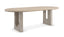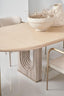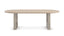 A modern design staple, this extension dining table makes use of intricate details to add emphasis and make a statement. An elegant, oval top in Sun Drenched Oak offers ample room for guests to intimately gather. Drawing the eye: parsons-style legs with dramatically stepping arches, meticulously crafted in Silver Travertine stone and trimmed in Lucent Bronze plated metal. FEATURES: Top finished in Sun Drenched Oak. Leg posts in Silver Travertine stone. Base metal trim in Lucent Bronze Plated Metal. Extends to 304.5cm with one 61cm leaf.