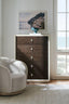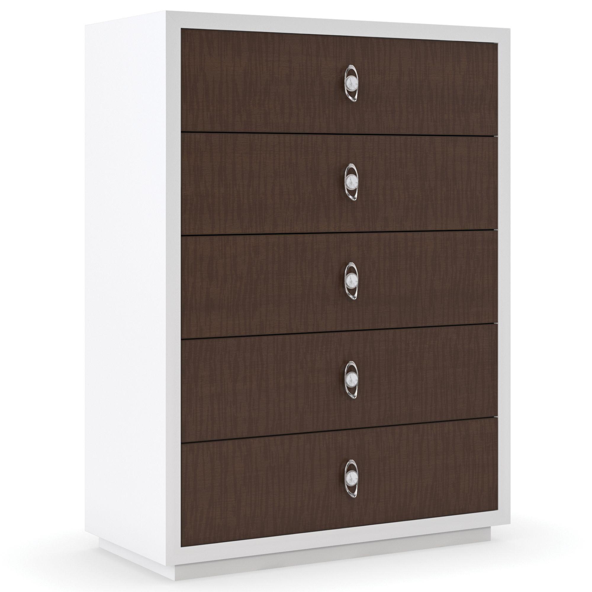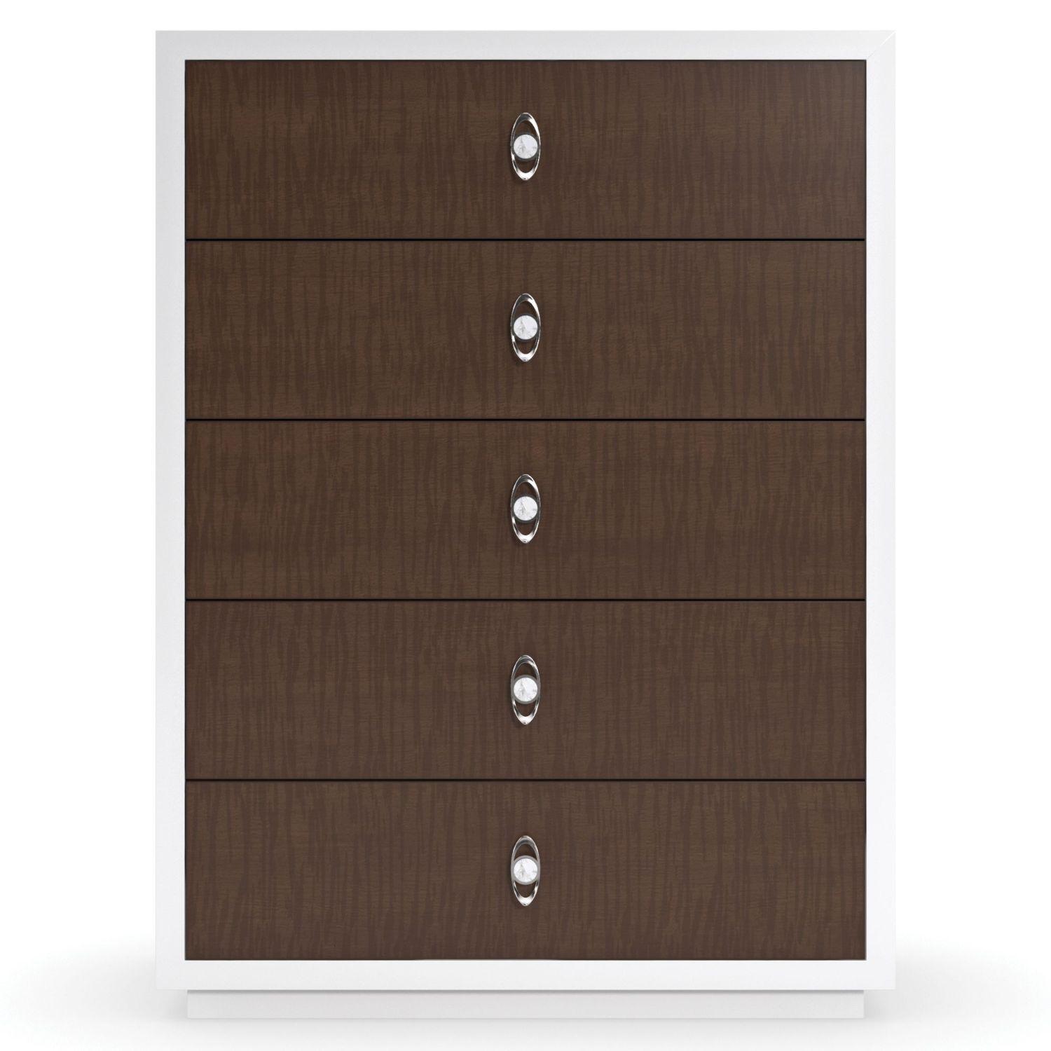 A serene storage solution for your bedroom sanctuary, this streamlined dresser evokes simplicity and a connection with nature. A contrasting Cloud White finish frames drawer fronts crafted in a figured sycamore veneer, to showcase the wood’s intricately beautiful grain. Five soft-close drawers offer generous space for organization and storage. Cast metal drawer pulls in Satin Nickel recall the delicate design of a handcrafted cuff bracelet with a ceramic detail at the centre.Case finished in Cloud White.Five drawers with fronts in Brunette and undermount soft close guides.Drawer interior in Cloud White.