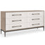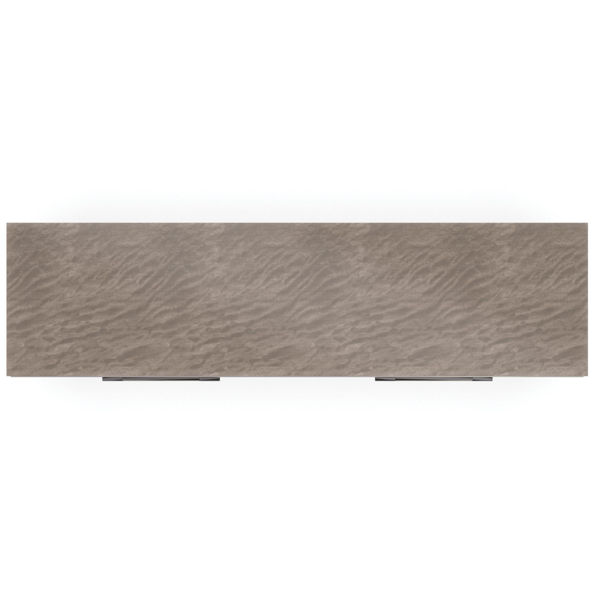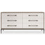 The dresser's case is also finished in Mountain Smoke, creating a cohesive and sophisticated look. The metal base and front frame molding in Deep Bronze add a touch of glamour and elegance. The six drawers, finished in Pearly White, feature undermount soft close guides for smooth and quiet operation. The drawer interiors are also finished in Pearly White, adding to the overall luxurious feel of the dresser.