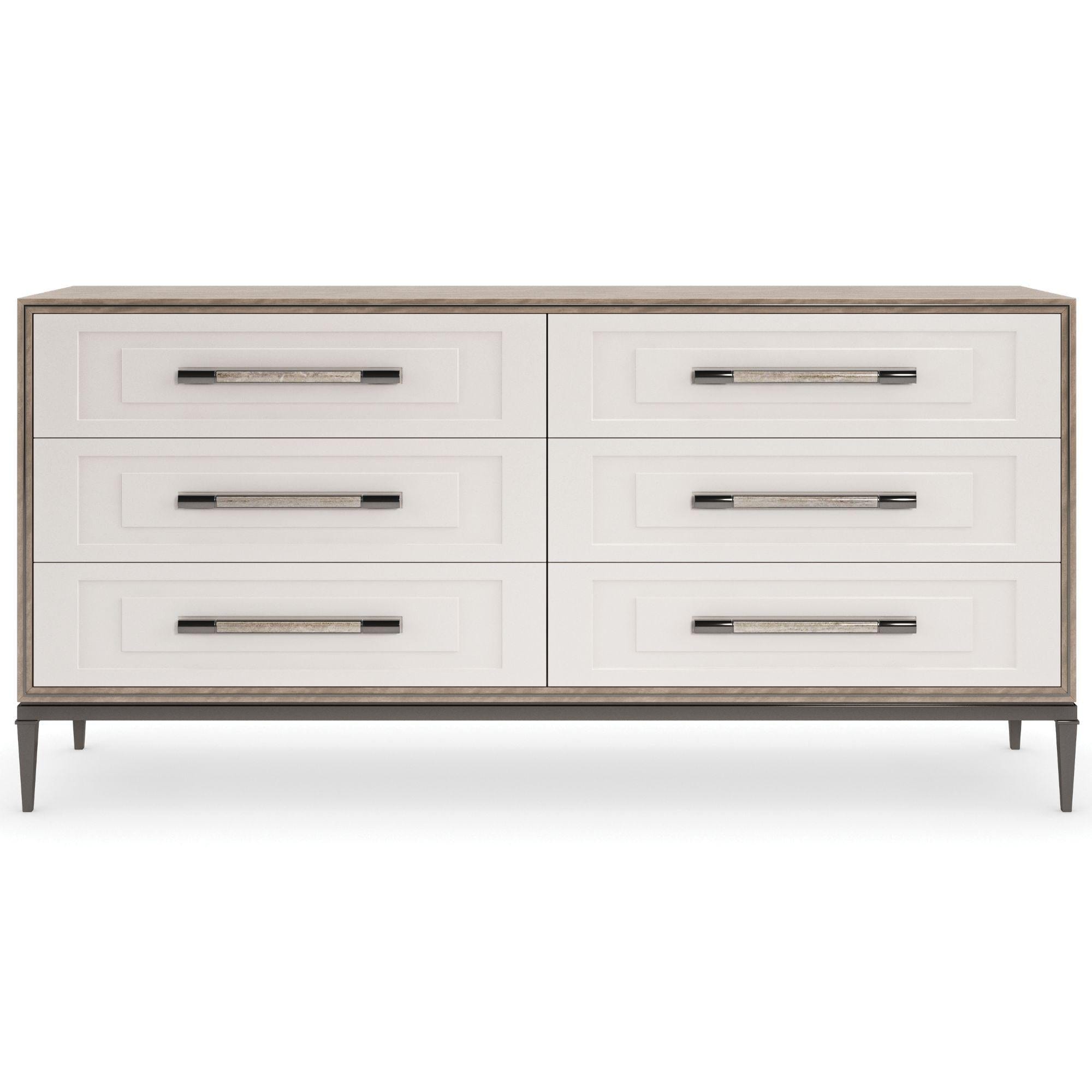 Introducing the Caracole Impressive Bedroom Dresser, a truly unique and luxurious piece of furniture. Meticulously designed with attention to detail and high-quality materials, this dresser is perfect for any bedroom, whether it be a casual retreat or a stately bedchamber. The stepped drawer fronts in a Pearly White finish add subtle shadow and dimension, while the custom hardware with a ceramic inlay resembles elegant jewelry. The six spacious drawers are framed in Deep Bronze metal trim and encased in Silver Curupixa veneers, finished in Mountain Smoke to showcase its exquisite wood grain.