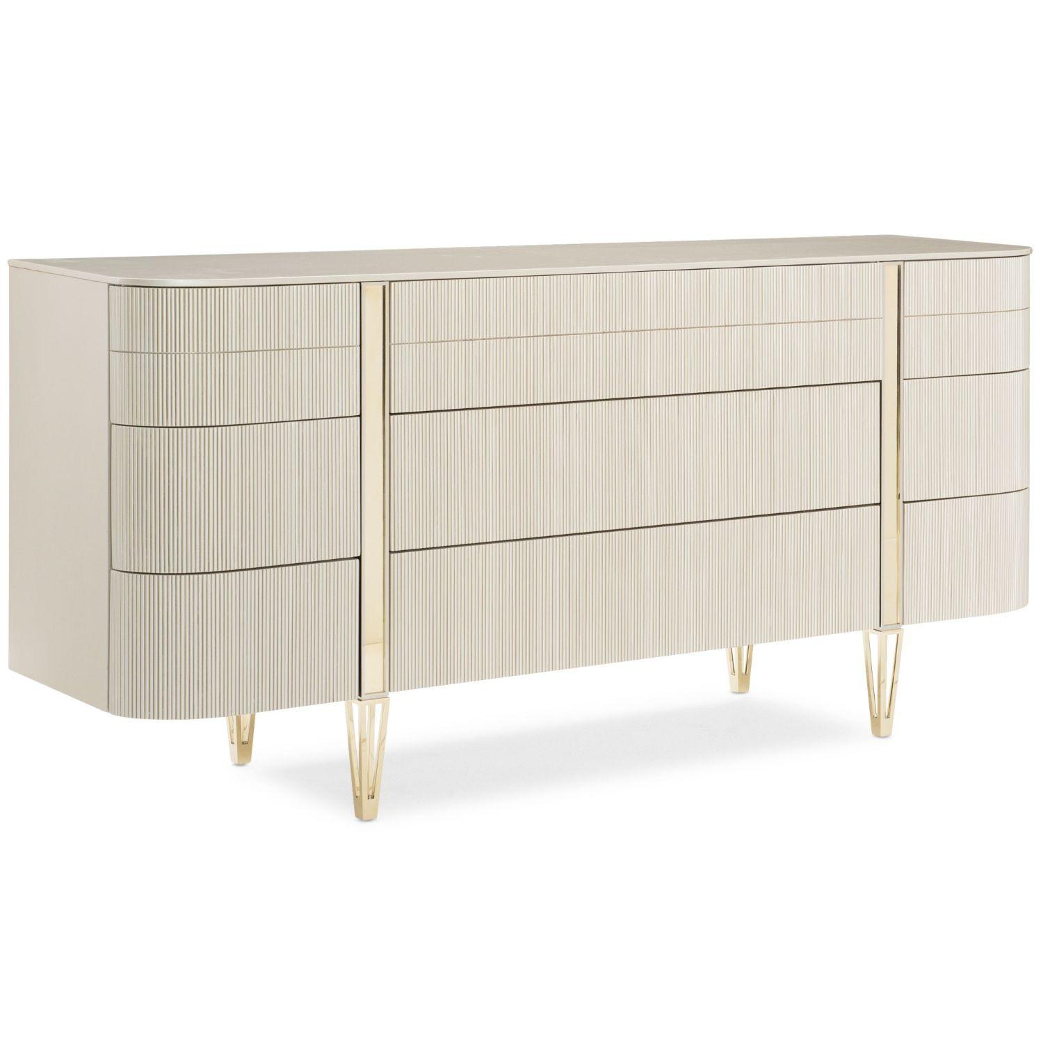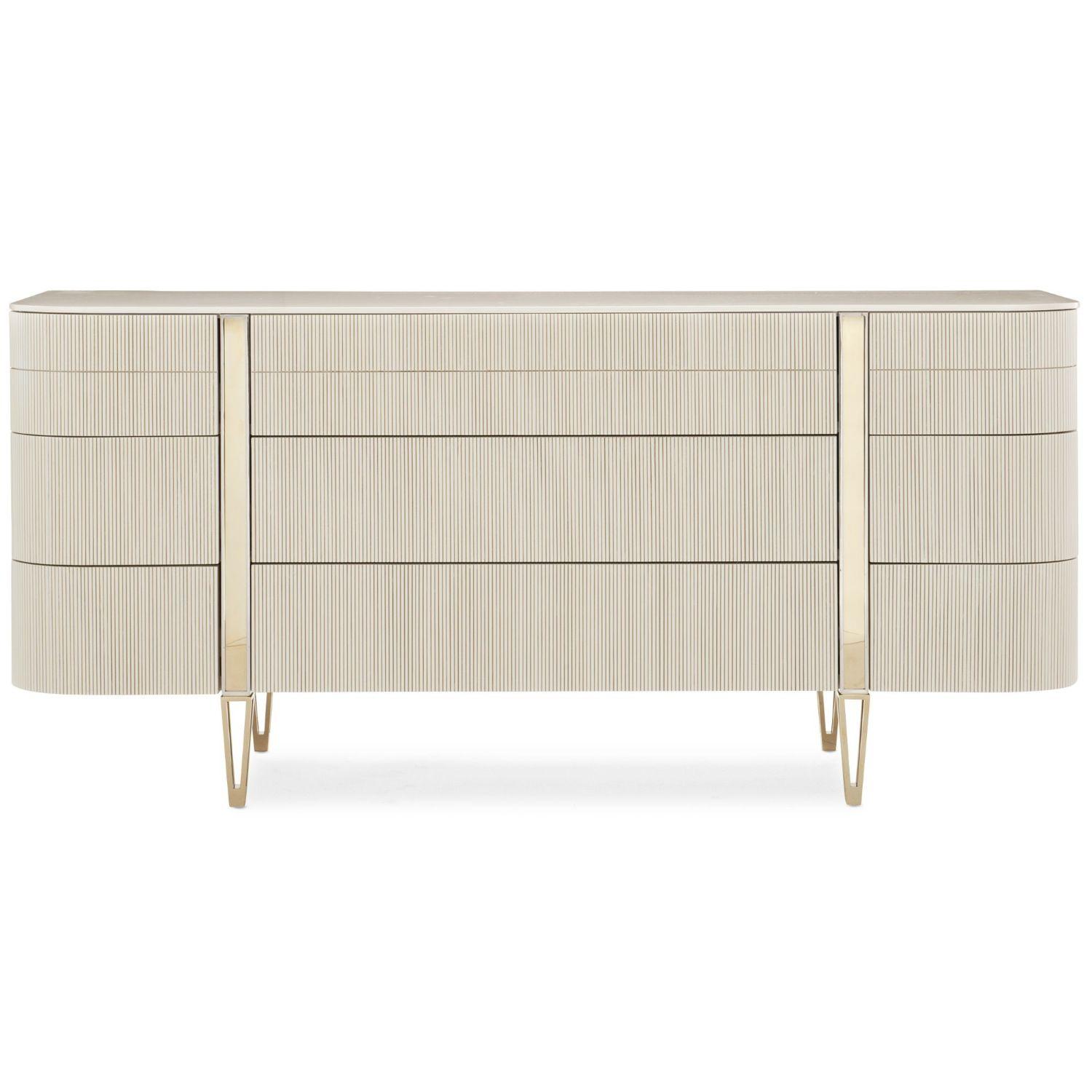 As rare as Love at First Sight, you’re sure to find this dazzling dresser is a dream come true. Representing the ultimate combination of form and function, it creates a space worthy of your finest clothing. All drawers are completely finished and wear Matte Pearl. The gracefully rounded profile of its fashion-forward design adds visual appeal to any space and is accentuated with exquisite fluted drawer fronts, metal band detailing, designer legs, and a sophisticated finish palette of Whisper of Gold and Matte Pearl. Case finished in Matte Pearl. Nine touch latch drawers with undermount guides. Interior in Matte Pearl. Metal feet in Whisper of Gold.