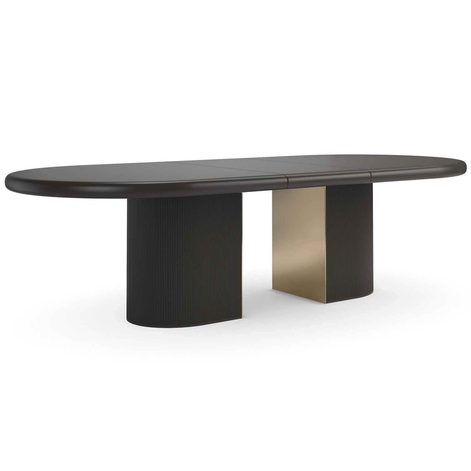 Love Extending Dining Table in Dark Chocolate 234-345cmWith an elegant oval shape, this large dining table rests upon a two-piece, round barrel base that showcases delicate vertical reeds in Dark Chocolate around its sides. The base can be separated to reveal flat sides with dramatic, reflective Whisper of Gold plates. Its top is Dark Chocolate, trimmed in a Whisper of Gold metal band. Comfortably seats 12 when extended.FEATURES:Table finished in Dark Chocolate.Metal trim in Whisper of Gold.Table Extends to 345.44cm with two 55.88cm leaves.Table seats 12 when fully extended with two on the ends.Caracole ClassicTaking the classics of furniture design and pairing with unique materials and refined finishes, this portfolio was born of our vision to create high-style furniture with a personality of elegance and individuality. Bring a breath of fresh air to interiors with distinctive pieces for every room of the home, while blurring the lines between classical styling and modern taste. These playfully named pieces address whole room environments through an eclectic lifestyle approach, instilling a scheme with versatile furniture that are sophisticated, creative and classy in equal measure.