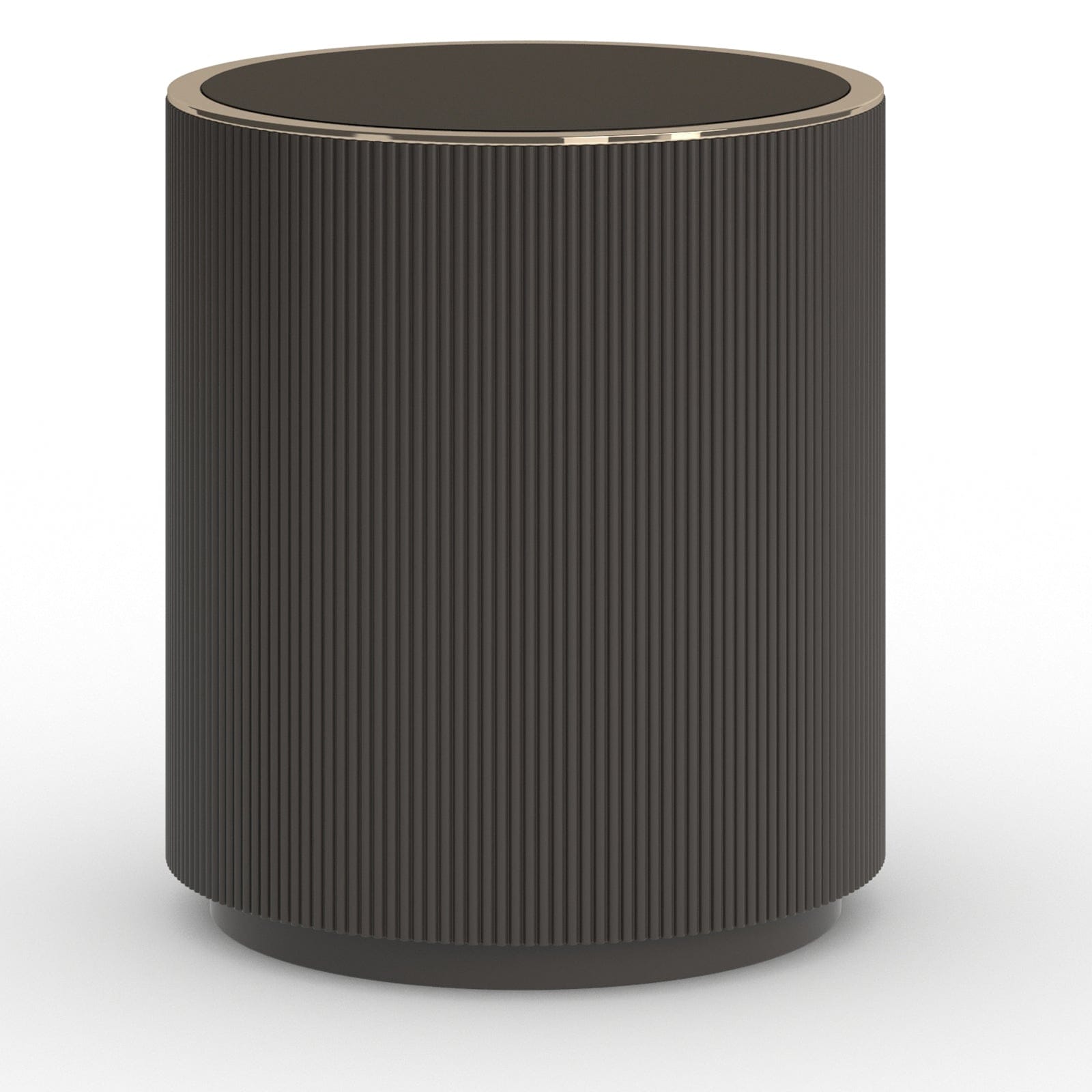 Love Round Side Table in Dark ChocolateA petite barrel table like this can fit in any space. This feminine piece has a smoked bronze glass top and delicately fluted casework in Dark Chocolate surrounding the piece. Inside a one-touch latch door with Whisper of Gold hardware discover one interior adjustable shelf with a finish that matches the piece.FEATURES:Smoked Bronze glass top.Reeded base in Dark Chocolate.Metal in Whisper of Gold.One touch latch door with interior adjustable shelf.Interior finish to match.Caracole ClassicTaking the classics of furniture design and pairing with unique materials and refined finishes, this portfolio was born of our vision to create high-style furniture with a personality of elegance and individuality. Bring a breath of fresh air to interiors with distinctive pieces for every room of the home, while blurring the lines between classical styling and modern taste. These playfully named pieces address whole room environments through an eclectic lifestyle approach, instilling a scheme with versatile furniture that are sophisticated, creative and classy in equal measure.