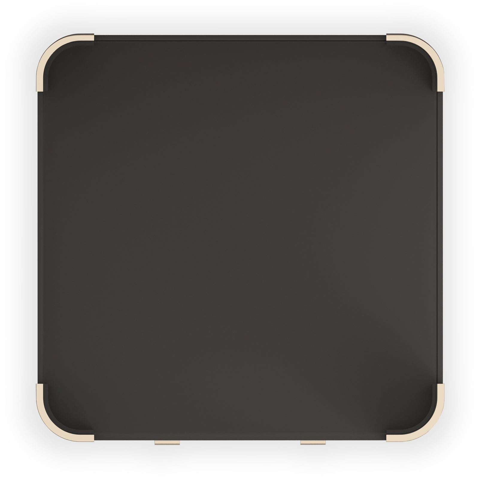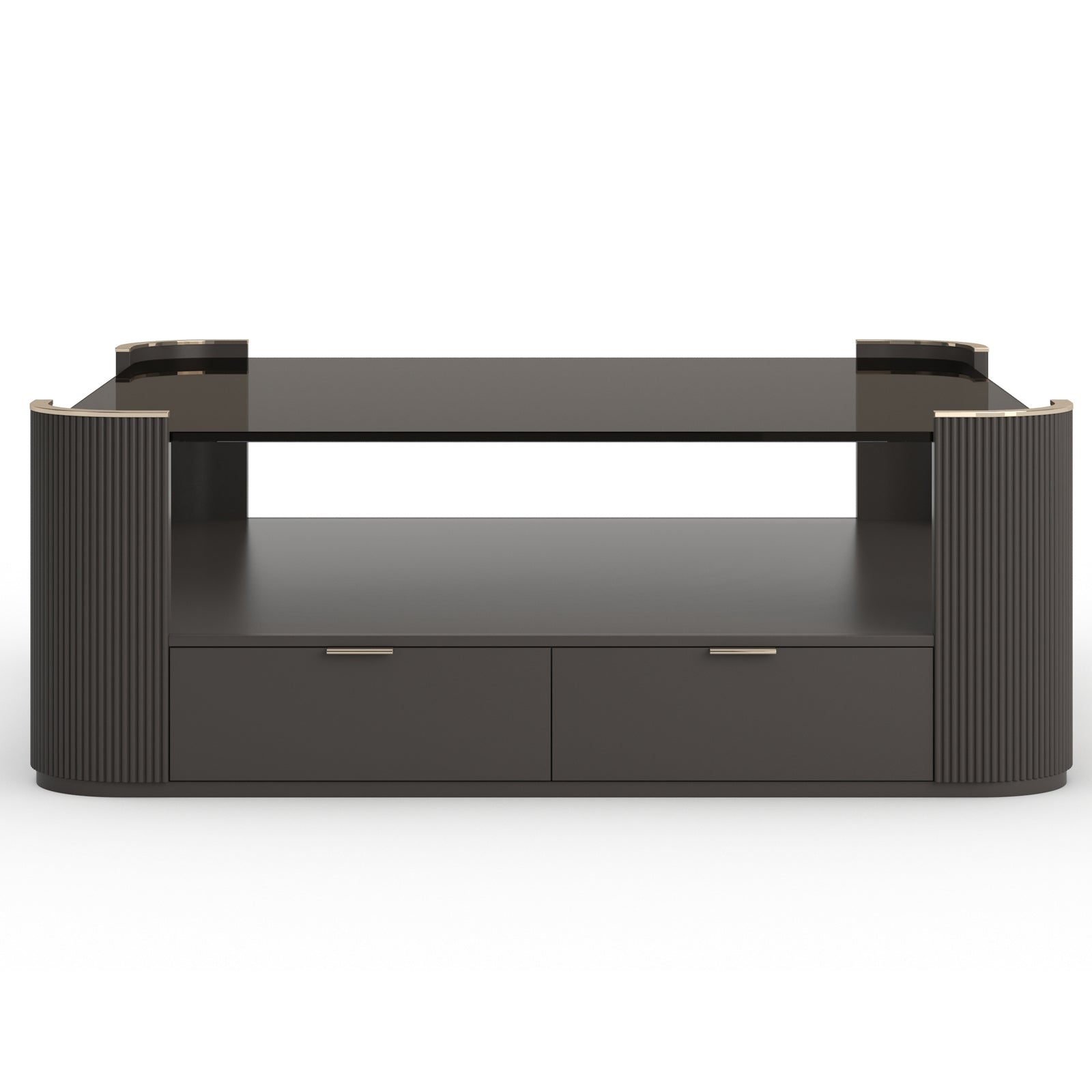 Love Square Coffee Table in Dark ChocolateA square cocktail offers the most design flexibility in a room and this piece is no exception. It easily groups with other chairs and tables in a room. This piece has a clear glass top and half-moon fluted casework at each rounded corner in Dark Chocolate. There is an open storage area for magazines, two drawers at the bottom, Caracole-stamped Whisper of Gold metal tab pulls and soft-close under mounts. The drawer interiors are finished to match.FEATURES:Smoked Bronze glass top.Case finish Dark Chocolate.Hardware in Whisper of GoldOpen storage area.Two drawers with Caracole etched tab pulls and soft close undermount guides.Interior finish paint to matchCaracole ClassicTaking the classics of furniture design and pairing with unique materials and refined finishes, this portfolio was born of our vision to create high-style furniture with a personality of elegance and individuality. Bring a breath of fresh air to interiors with distinctive pieces for every room of the home, while blurring the lines between classical styling and modern taste. These playfully named pieces address whole room environments through an eclectic lifestyle approach, instilling a scheme with versatile furniture that are sophisticated, creative and classy in equal measure.