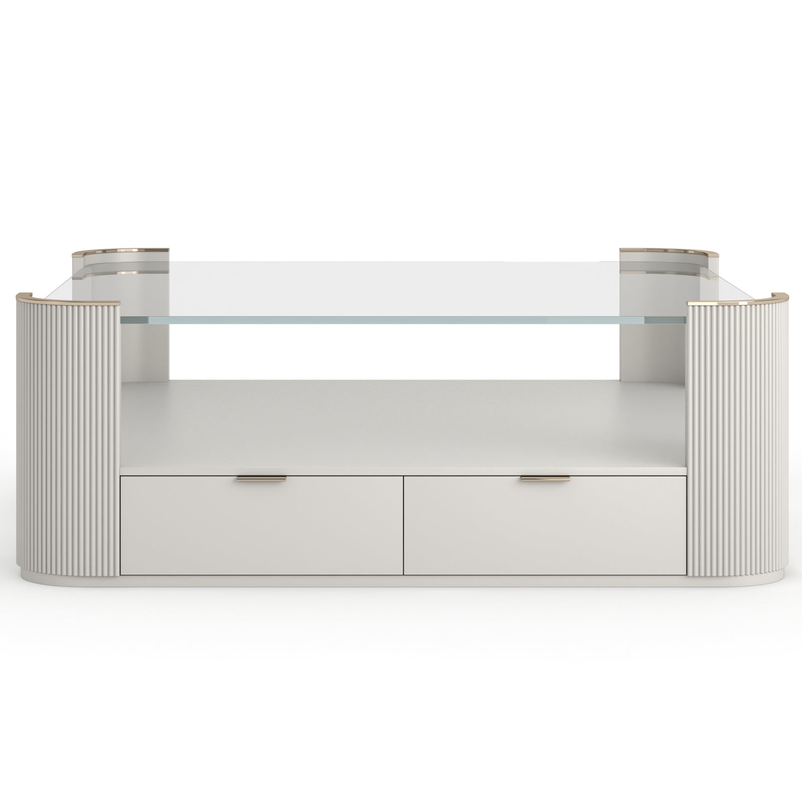 Love Square Coffee Table in Matte PearlA square cocktail offers the most design flexibility in a room and this piece is no exception. It easily groups with other chairs and tables in a room. This piece has a clear glass top and half-moon fluted casework at each rounded corner in Matte Pearl. There is an open storage area for magazines, two drawers at the bottom, Caracole-stamped Whisper of Gold metal tab pulls and soft-close under mounts. The drawer interiors are finished to match.FEATURES:Clear glass top.Case finished in Matte Pearl.Hardware in Whisper of GoldOpen storage area.Two drawers with Caracole etched tab pulls and soft close undermount guides.Interior finish paint to match.Caracole ClassicTaking the classics of furniture design and pairing with unique materials and refined finishes, this portfolio was born of our vision to create high-style furniture with a personality of elegance and individuality. Bring a breath of fresh air to interiors with distinctive pieces for every room of the home, while blurring the lines between classical styling and modern taste. These playfully named pieces address whole room environments through an eclectic lifestyle approach, instilling a scheme with versatile furniture that are sophisticated, creative and classy in equal measure.