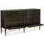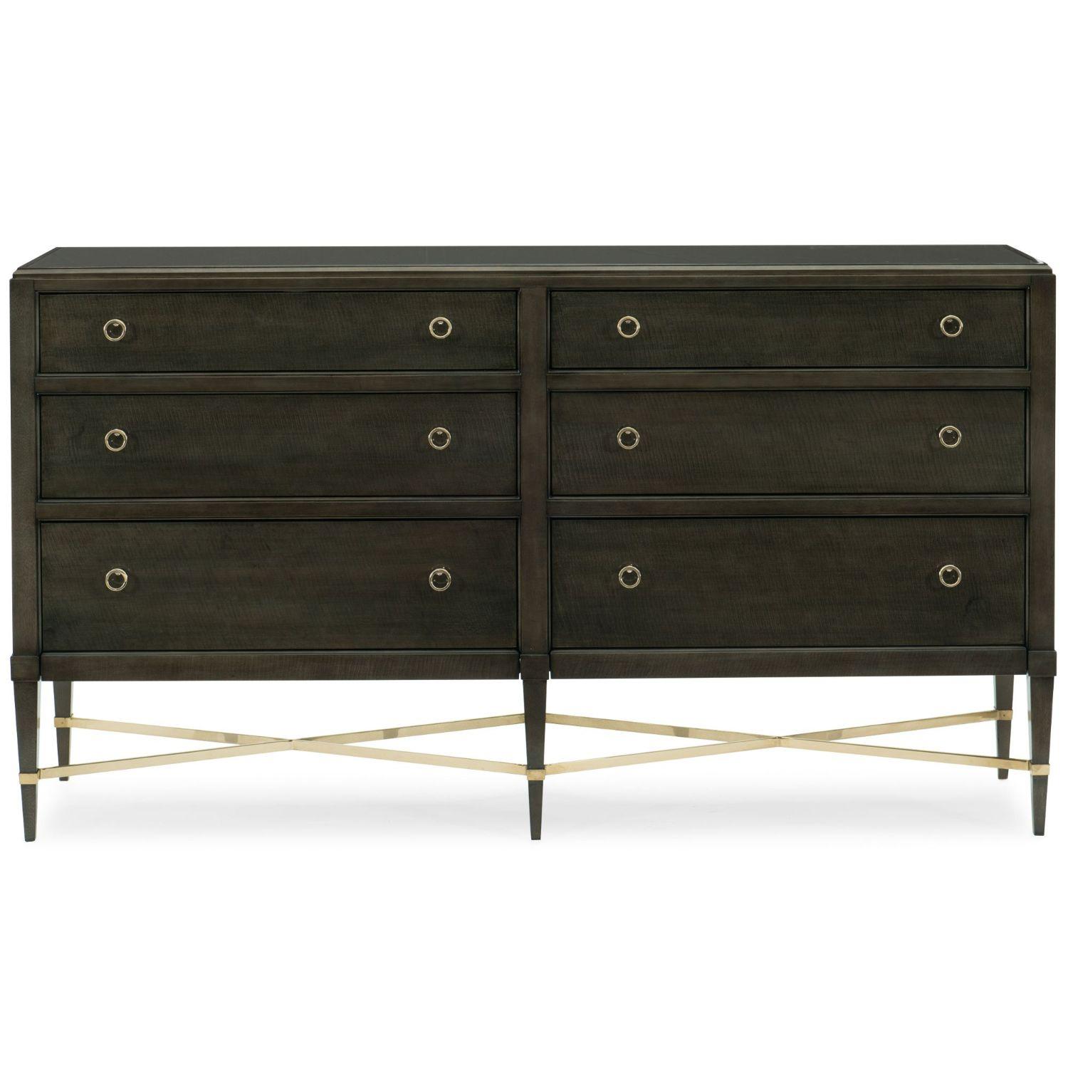 Introducing the Caracole Masterpiece Bedroom Dresser - a true masterpiece in every sense. This dresser boasts a modern interpretation of classic Hepplewhite designs, with a linear frame in Charcoal Anegre. Its clean façade is adorned with custom round ribbed pulls in Whisper of Gold, adding a touch of elegance to the piece. But what truly sets this dresser apart are its hidden secrets.
