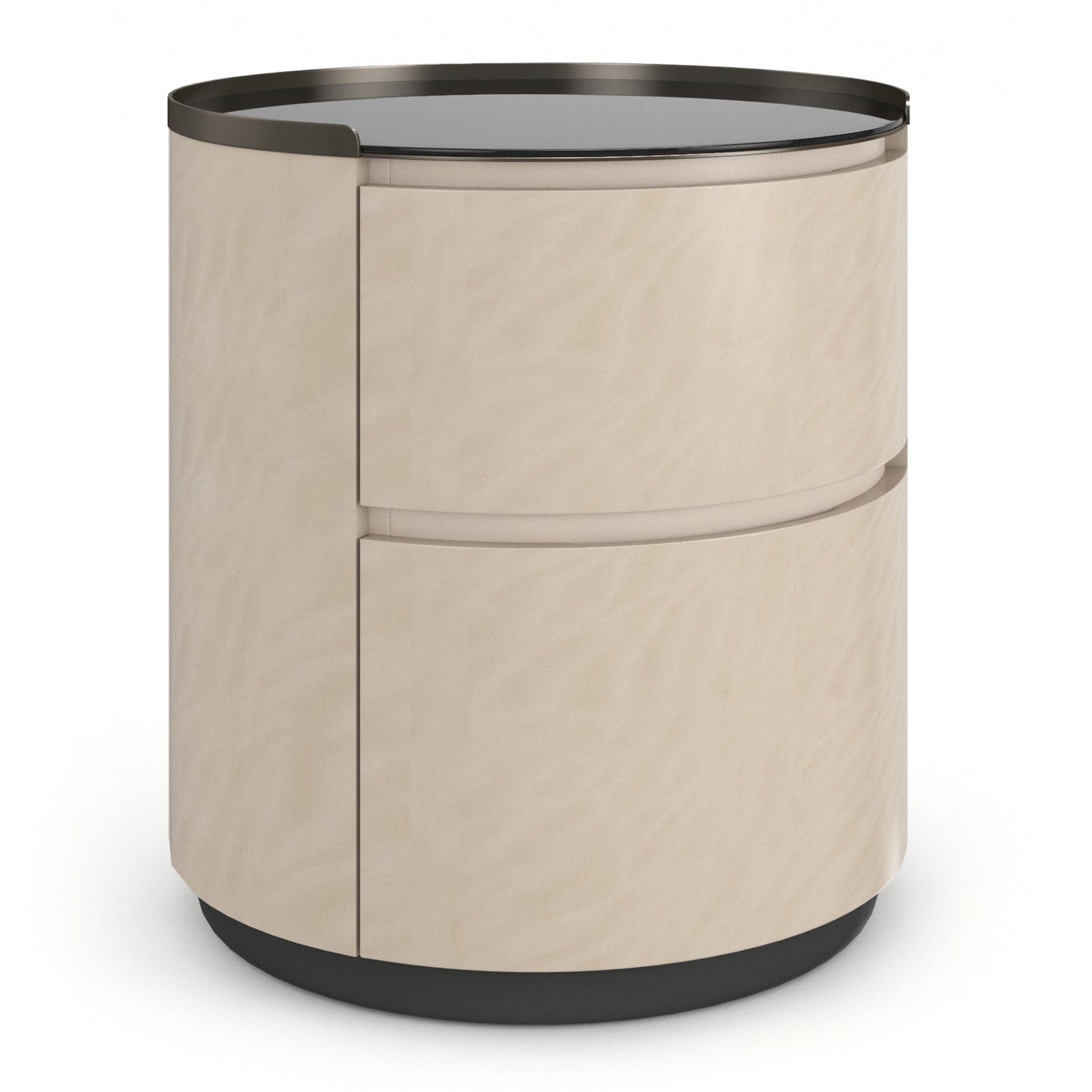 Muse Bedside TableThe Curupixa wood featured on this piece has glorious wavy grains shown with a cloud-like Nebulous finish. The wood lends visual movement to this round nightstand. The unique wood contrasts with a sultry Smoked Bronze mirror top, partially encased with a thin bar rail in Deep Bronze metal. Two deep rounded drawers have soft-close under-mounts grooved finger pulls. The plinth base is Dark Chocolate; the interior finish is UV Linen.FEATURES:Smoked Bronze mirror top.Case finished in Nebulous.Metal trim in Deep Bronze.Two drawers with soft close undermount guides.Plinth base in Dark Chocolate.Drawer interior UV LinenCaracole ClassicTaking the classics of furniture design and pairing with unique materials and refined finishes, this portfolio was born of our vision to create high-style furniture with a personality of elegance and individuality. Bring a breath of fresh air to interiors with distinctive pieces for every room of the home, while blurring the lines between classical styling and modern taste. These playfully named pieces address whole room environments through an eclectic lifestyle approach, instilling a scheme with versatile furniture that are sophisticated, creative and classy in equal measure.