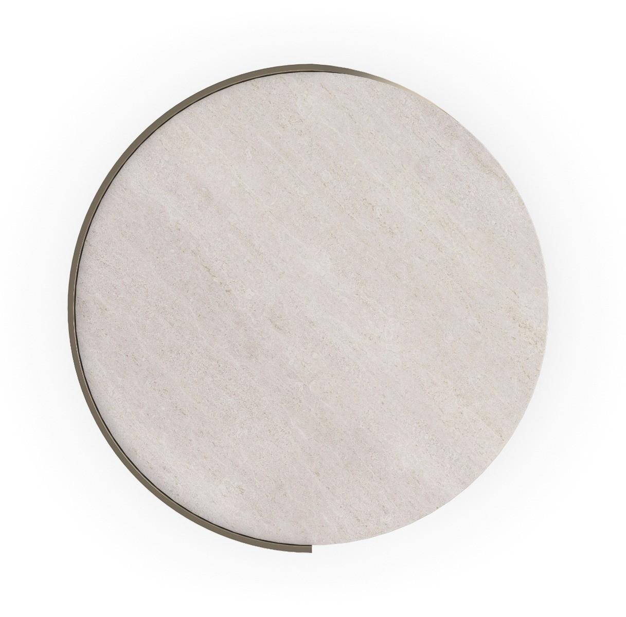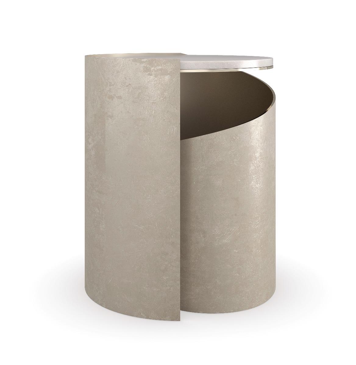 Inspired by the elegant spiral found in a nautilus shell, this spot table is topped with créme travertine, seemingly suspended above a graceful metal curve finished in Taupe Silverleaf. A Whisper of Gold adds a hint of glamour to its overall soft patina. Perfectly proportioned for holding a beverage or book. FEATURES: Creme Travertine stone top. Table plated in Whisper of Gold, outside edge leafed in random pattern Taupe Silverleaf.