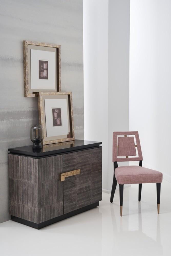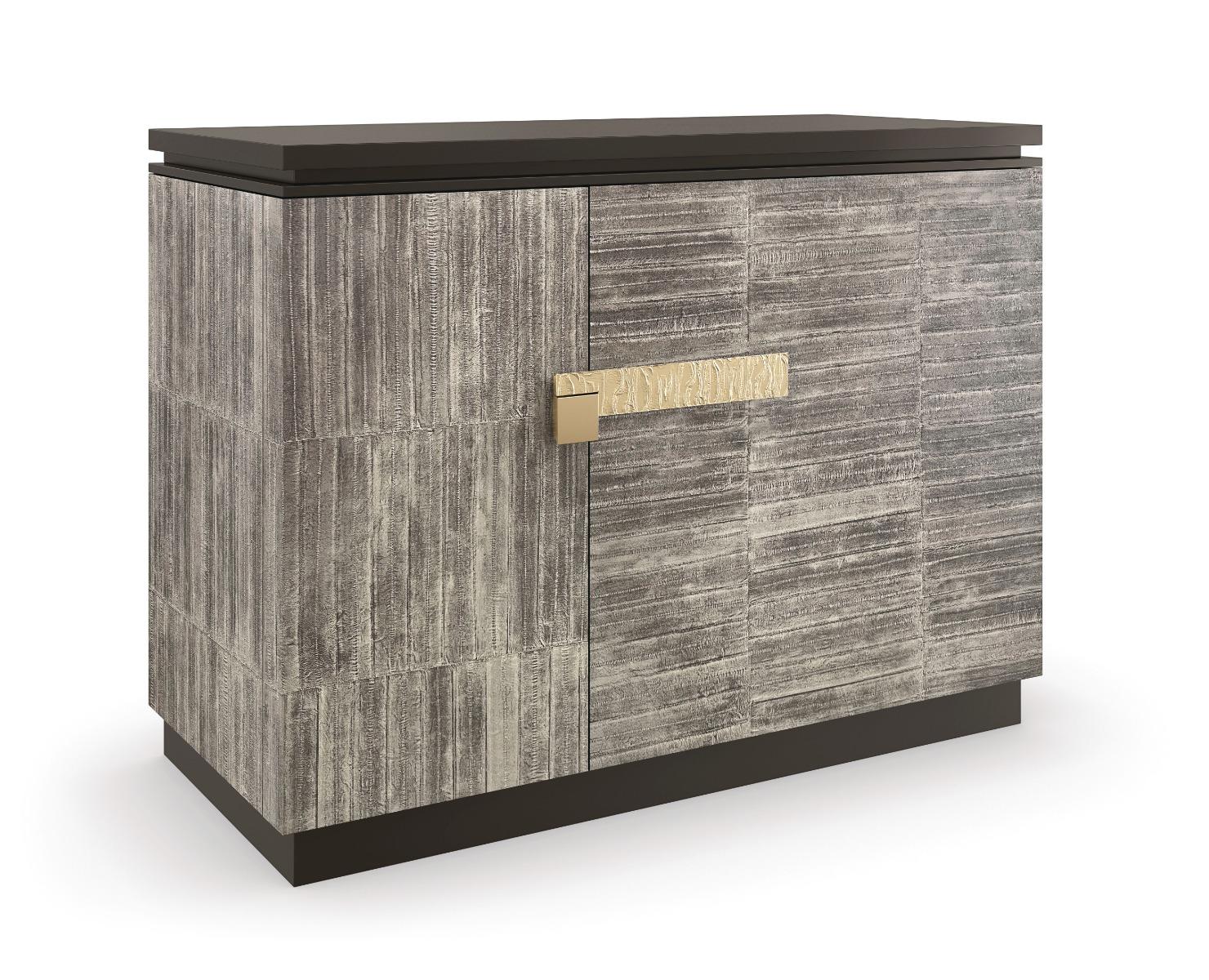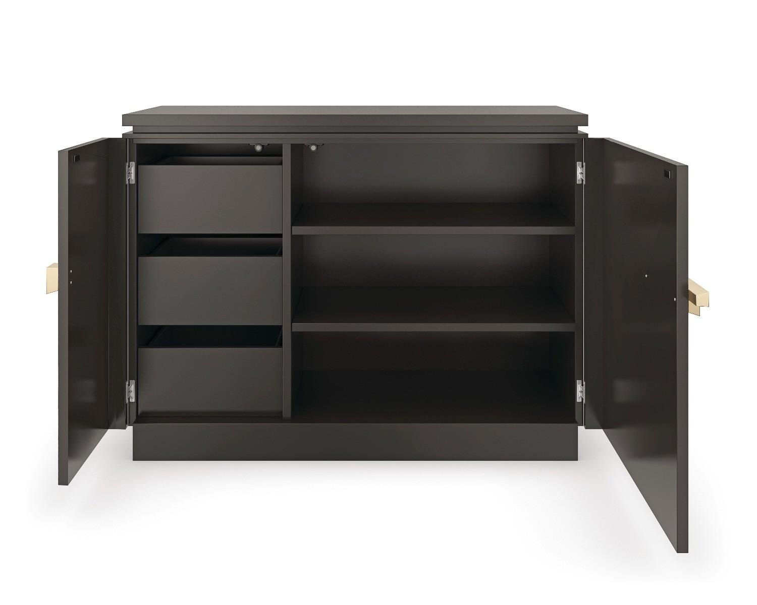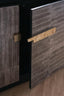 The Nigiri chest boasts a style that is both versatile and influenced by Japanese design, with sleek door fronts and custom two-piece hardware in Brushed Gold. Its Dark Chocolate interior features three soft-close drawers and adjustable shelves, providing ample space for storage. The metallic charcoal paper wrap adds a touch of luxury and mimics the look of eel skin. This piece is the perfect addition to any living, dining, or home office space. FEATURES: Case frame finished in Dark Chocolate. End panels and door fronts wrapped in Smoked Unagi. Behind left door are three drawers with side guides. Behind right door are two adjustable shelves. Interior in Dark Chocolate. Plinth base in Dark Chocolate. Metal hardware in Brushed Gold.