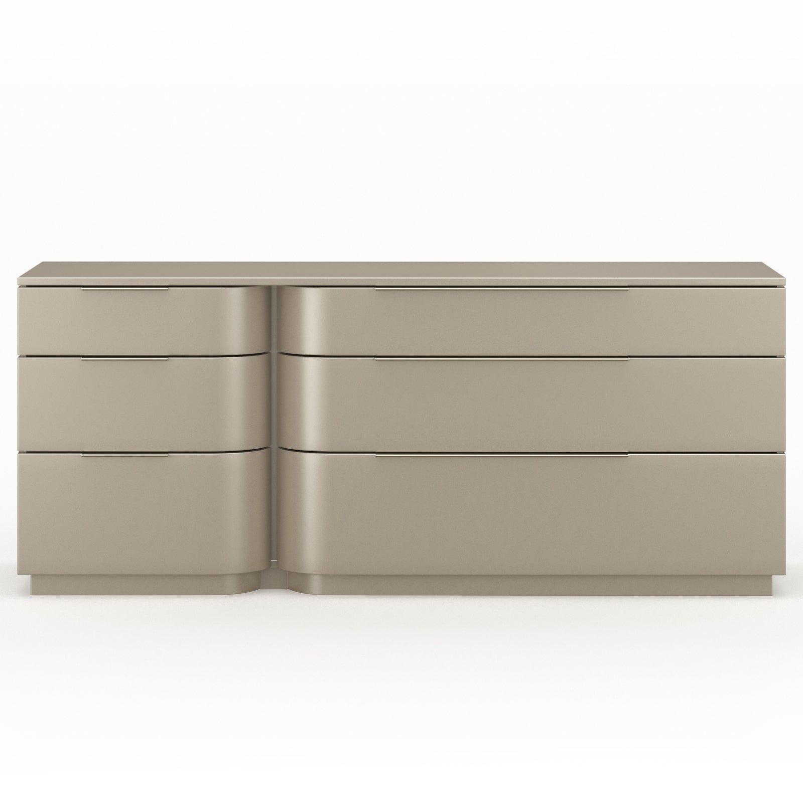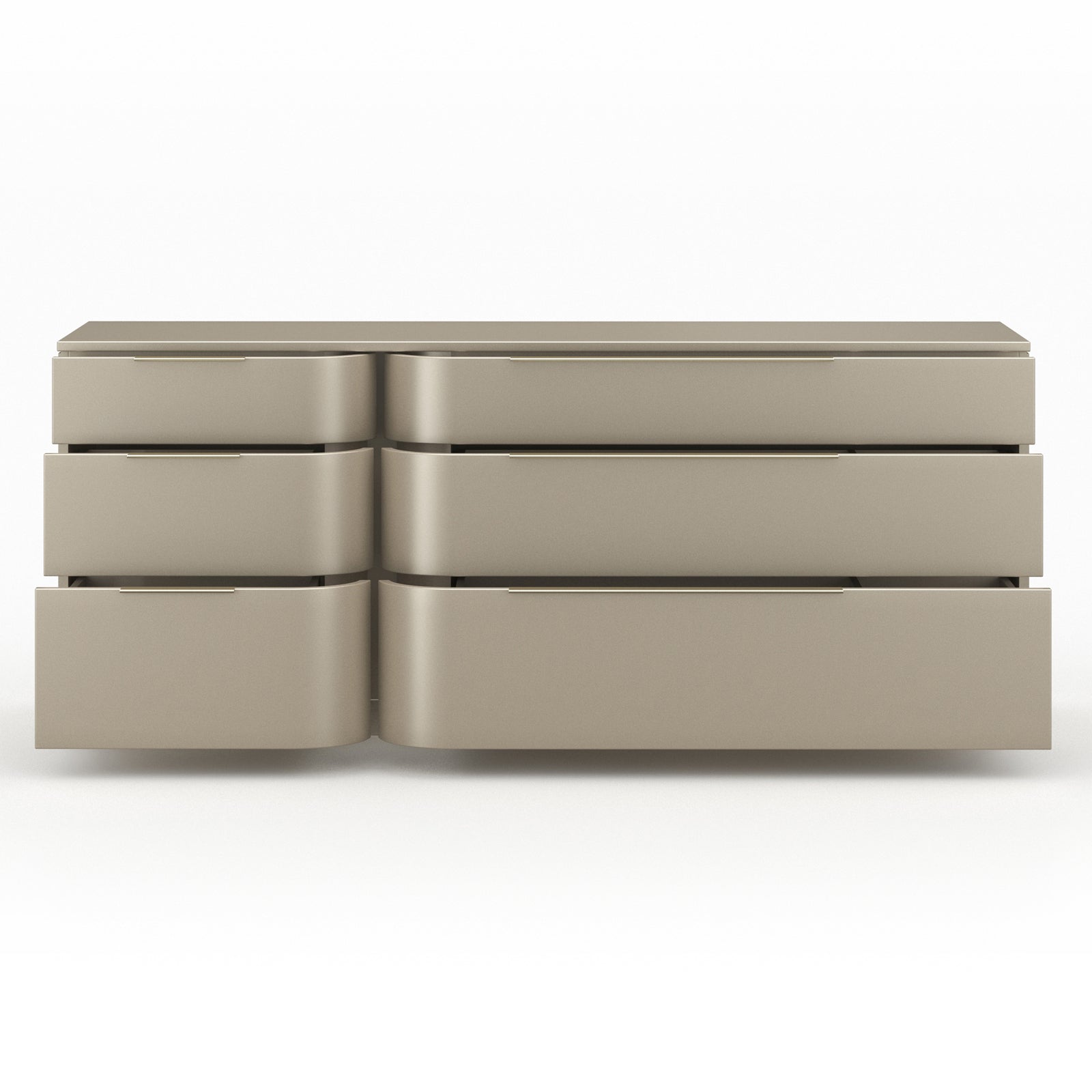 Oblique Chest of DrawersDeeply sloping filleted drawers come together in a deep, dramatic cleft that is offset on this streamlined, rectangular piece. Fully-finished in lustrous Soft Silver Paint Gloss inside and out with Brushed Whisper of Gold in the cleft, the slim, Brushed Whisper of Gold metal pulls are stamped with the Caracole logo. Six drawers of varying depths have soft-close under-mount guides for generous storage. The top left drawer features Caracole’s sliding jewelry tray in Crème velvet.FEATURES:Case finished in Soft Silver Paint Gloss.Six drawers with soft close undermount guides.Top left drawer with sliding Caracole Cream jewelry tray.Drawer interior in UV Platinum.Caracole ClassicTaking the classics of furniture design and pairing with unique materials and refined finishes, this portfolio was born of our vision to create high-style furniture with a personality of elegance and individuality. Bring a breath of fresh air to interiors with distinctive pieces for every room of the home, while blurring the lines between classical styling and modern taste. These playfully named pieces address whole room environments through an eclectic lifestyle approach, instilling a scheme with versatile furniture that are sophisticated, creative and classy in equal measure.