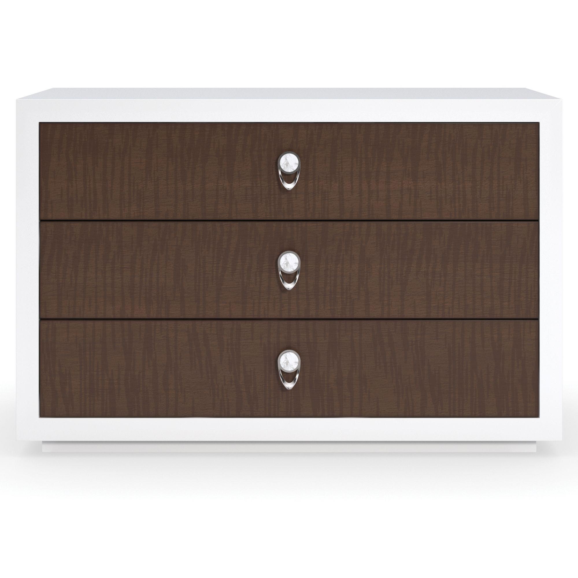 A calming addition to any bedroom retreat, this clean-lined dresser evokes simplicity and a connection with nature. Showcasing the intricately beautiful texture of figured sycamore, drawer fronts are framed in a contrasting Cloud White finish. Three soft-close drawers offer abundant space for organization and storage. Inspired by the delicate design of a handcrafted cuff bracelet, cast metal drawer pulls lend an eye-catching detail in Satin Nickel.Case finished in Cloud White.Three drawers with fronts in Brunette and side guides.Drawer interior in Cloud White.USB port and wire management holes on back of case.