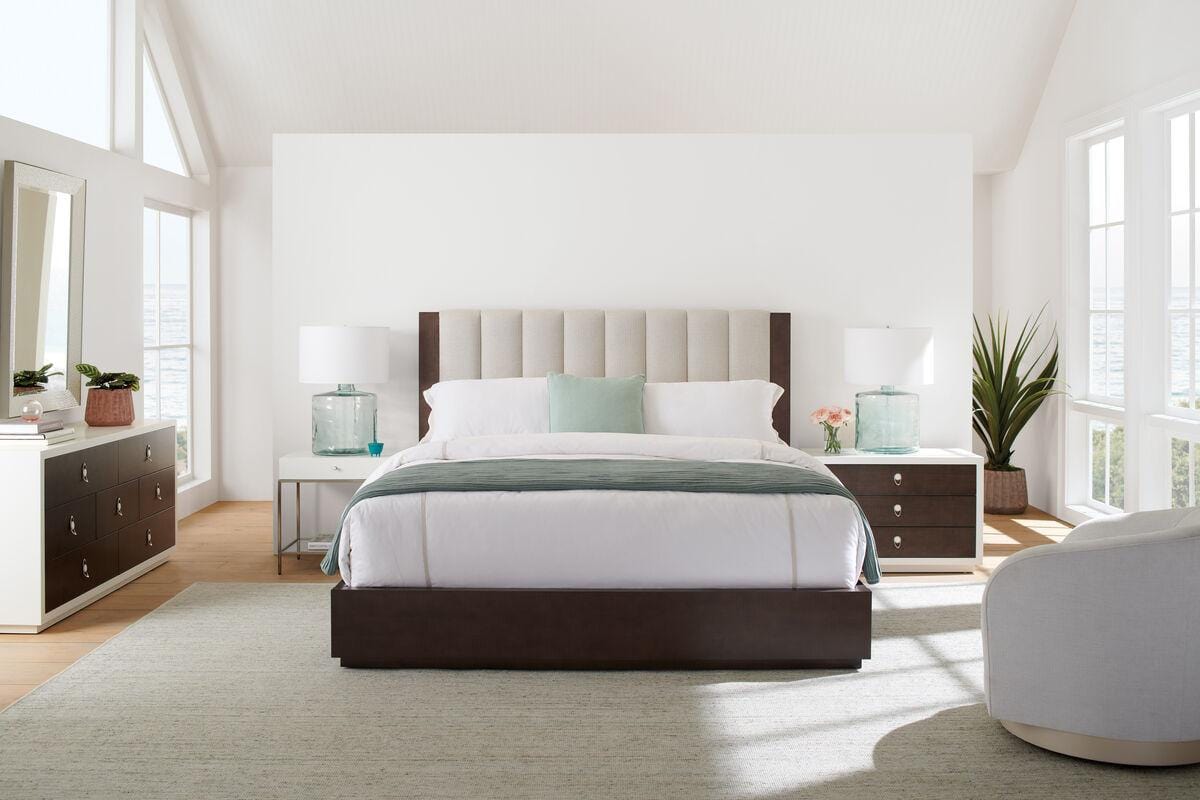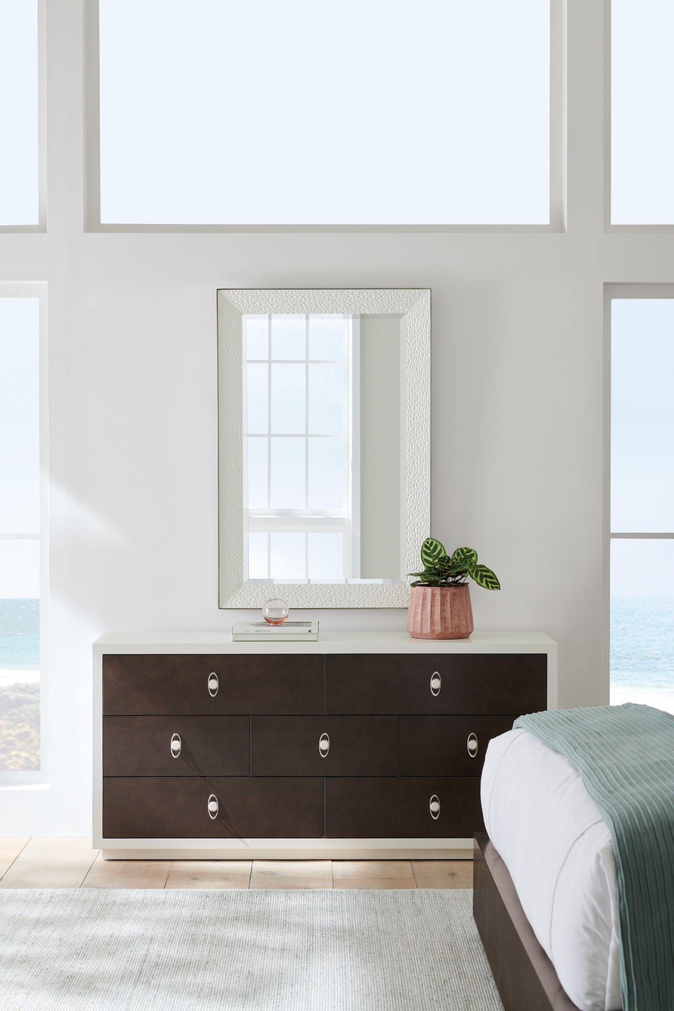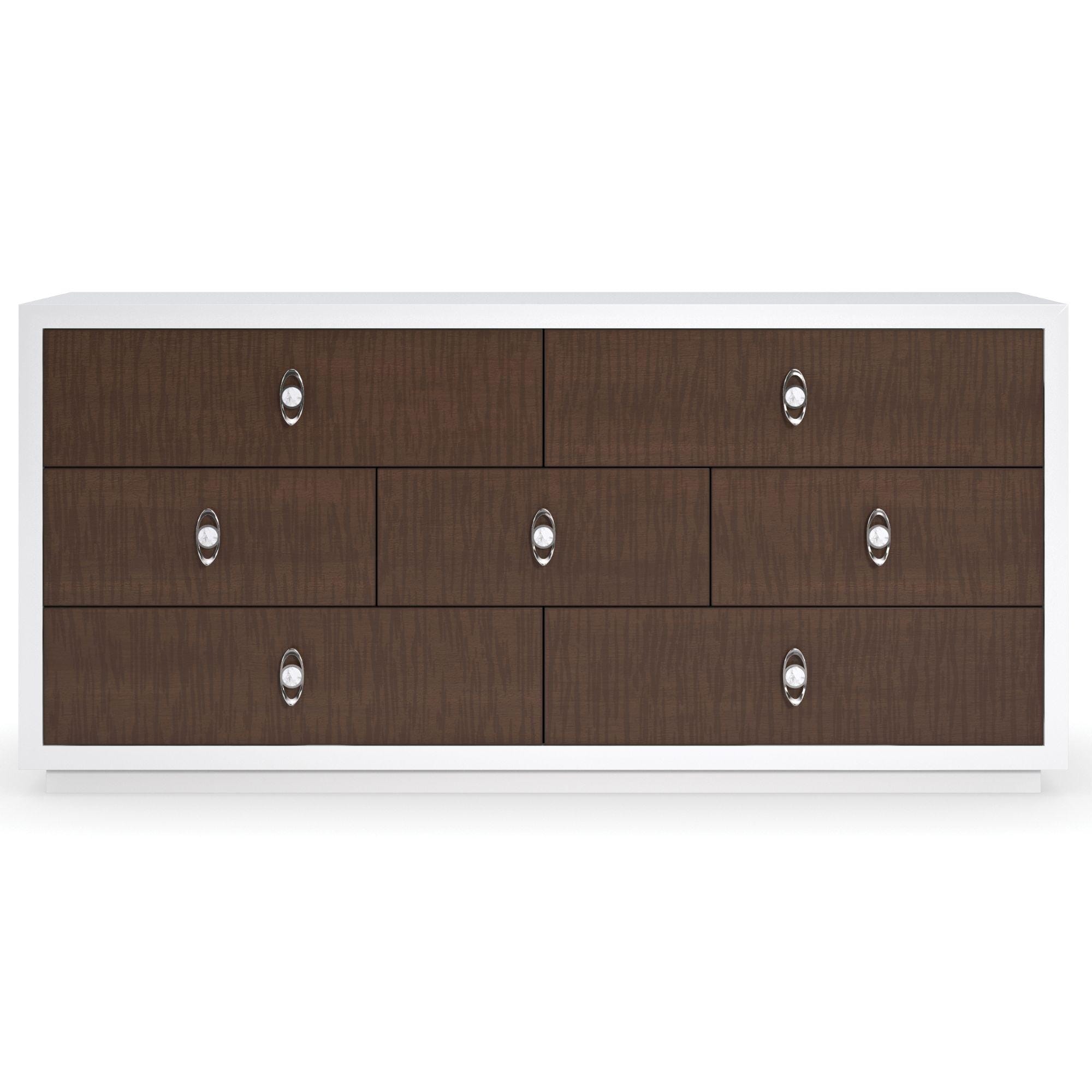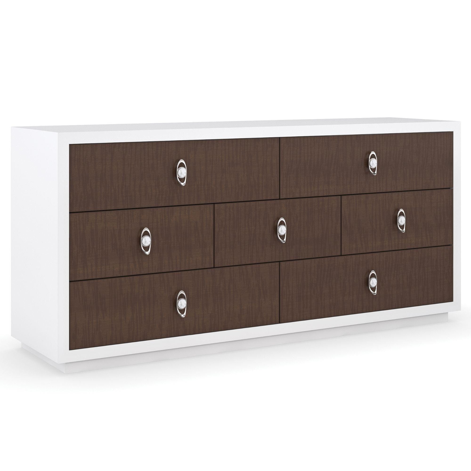 With drawer fronts crafted in a figured sycamore veneer, this bedroom dresser showcases the wood grain’s intricately beautiful texture. At the centre of attention, cast metal drawer pulls with a ceramic detail recall the delicate design of a handcrafted cuff bracelet. Offers generous storage with seven spacious, soft-close drawers.Case finished in Cloud White.Seven drawers with fronts in Brunette and undermount soft close guides.Drawer interior in Cloud White.