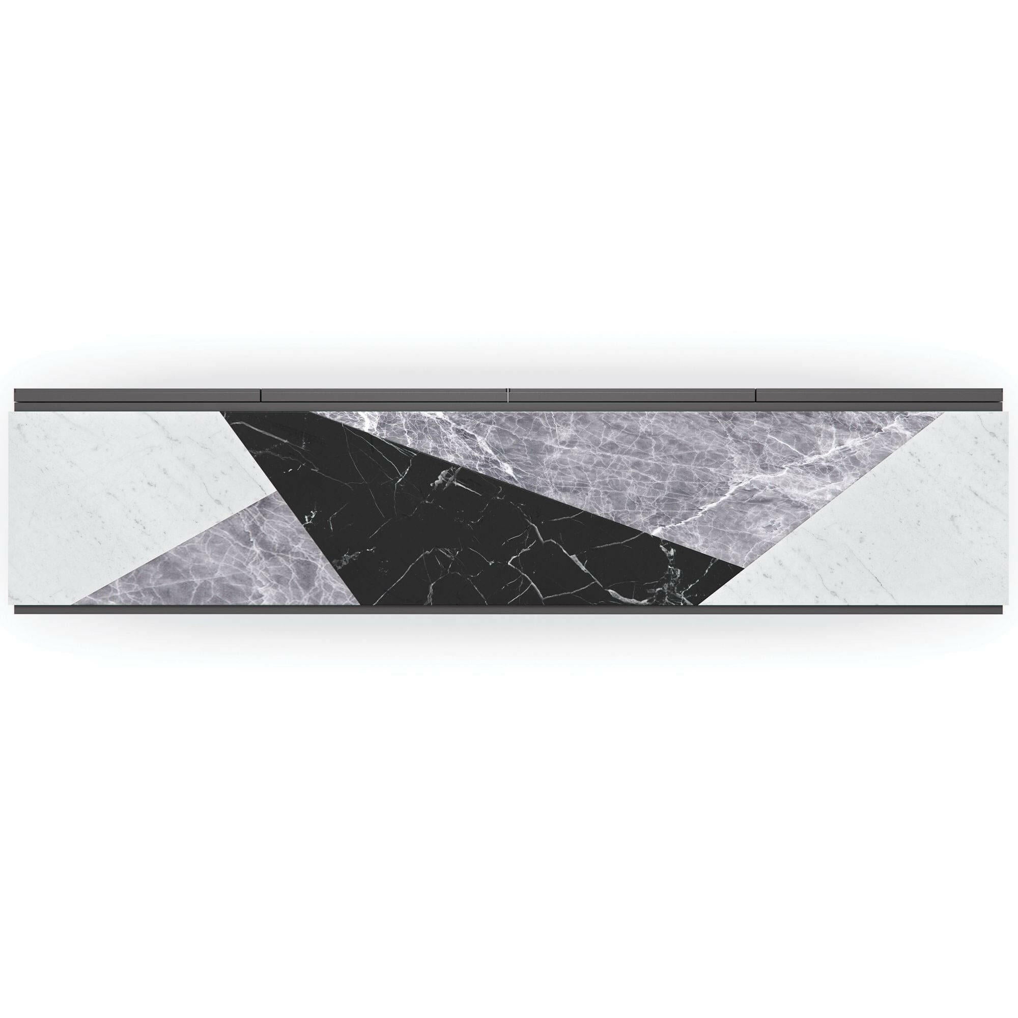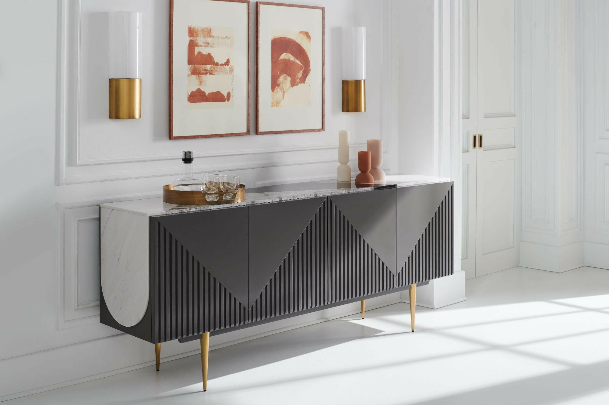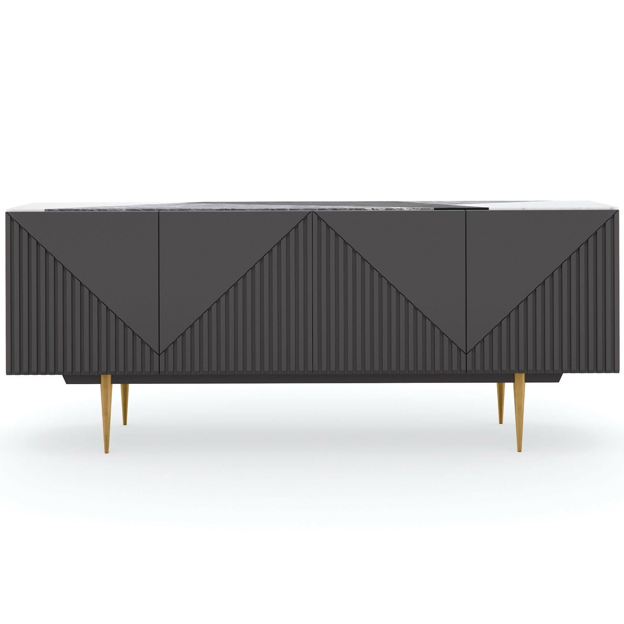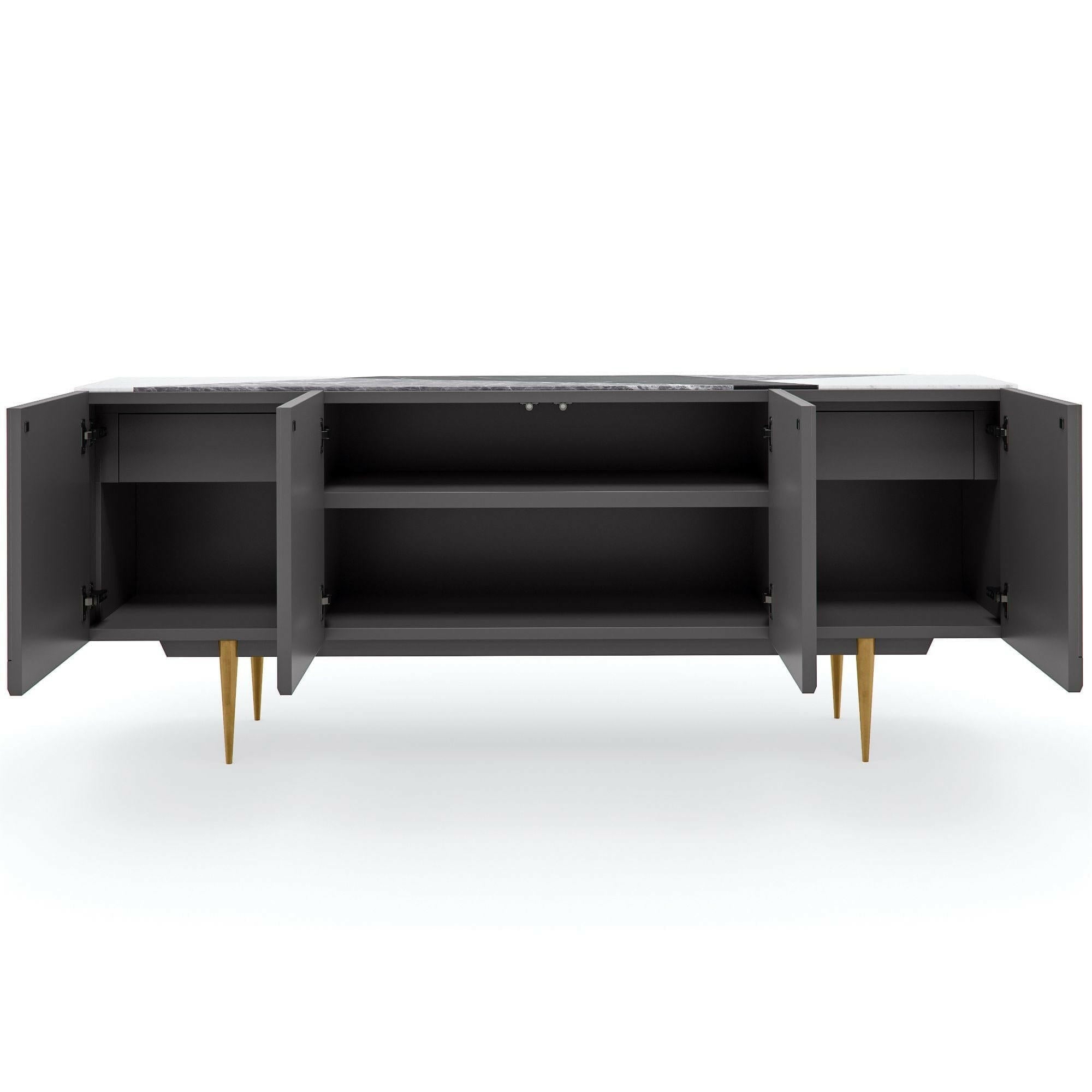 The Over the Edge Sideboard from House of Isabella is a unique and modern addition to any dining room. Its Warm Slate finish and mix of polished marble and stone create a contemporary look, while graphic slat details add dimension. The sideboard is supported by tapered metal legs in Champagne Gold, adding a touch of elegance. With two drawers, adjustable shelves, and touch-latch doors, this piece offers ample storage for hosting and happy hours. It can also be styled as a statement-making console in living rooms, halls, and entryways. The interior is finished in Warm Slate, completing the luxurious feel of this piece.