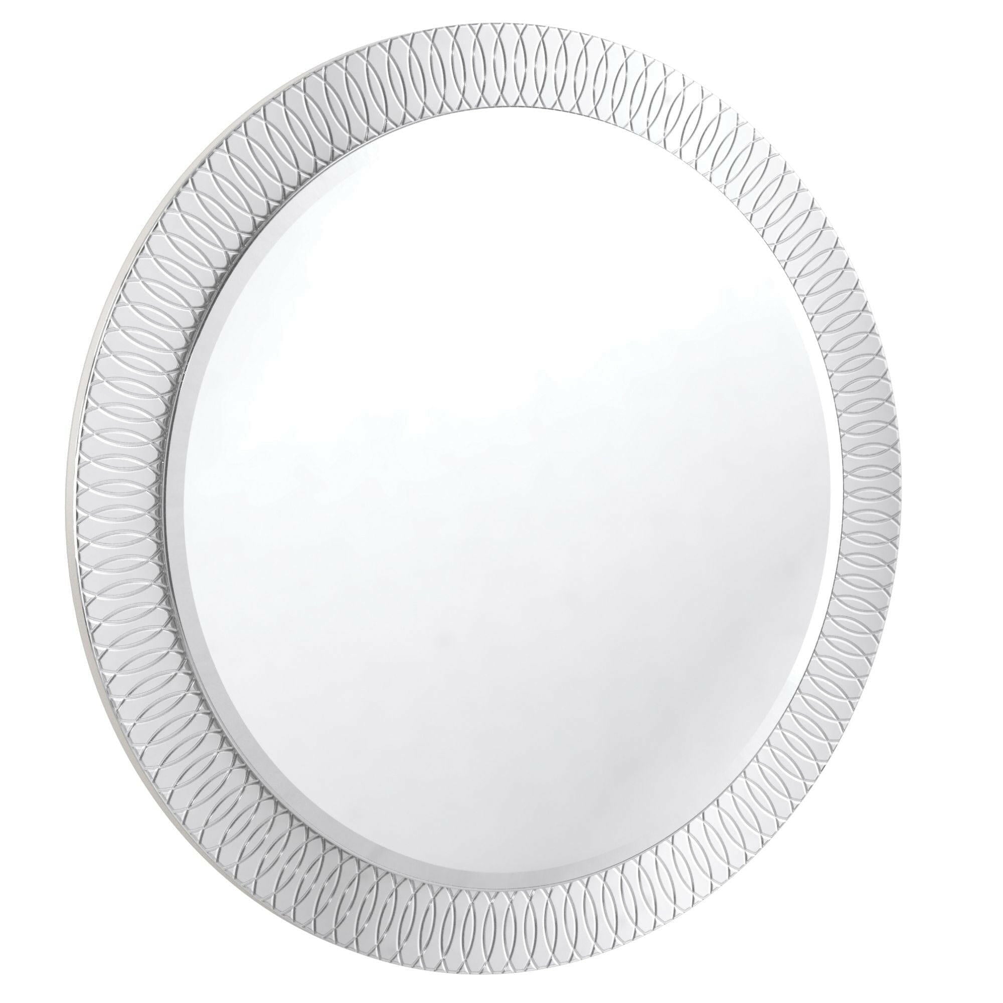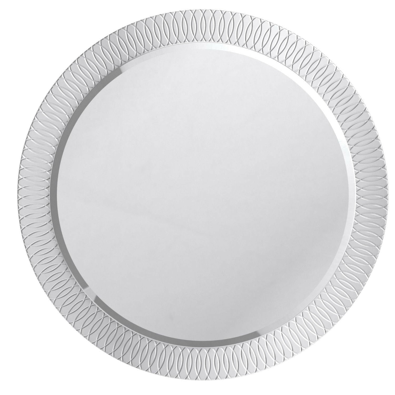 V-groove etched swirls create depth and a subtle framing effect, drawing attention to this large round wall mirror. For added elegance and reflection, its clear mirror centre features a beautiful, bevelled edge. Well-sized to hang above a dresser or dining room buffet, this alluring accent enhances the view and brightens any room. Frameless mirrored border with etching pattern. Clear mirror in center with 3/4" bevel. Back panel edge in Stardust.