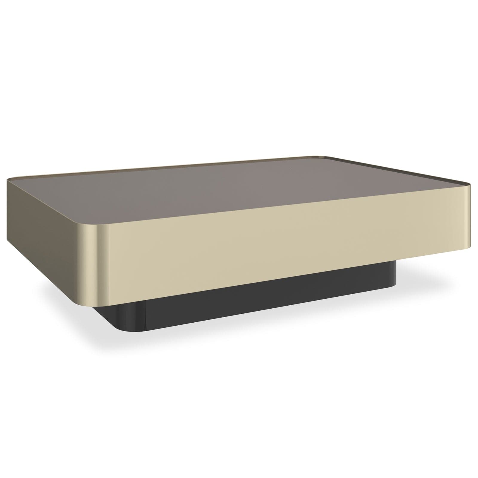 Periphery Coffee TableMemories of Studio 54 inspired this square-in-square cocktail table. Glossy and impressive, this large piece has deep sides and softened corners with dramatic Smoked Bronze Mirror top, banded in mirror-polished Whisper of Gold metal. The short, thin base is in Dark Chocolate. For a punctuation of color, an optional Rouge Red Gloss square tray purchased separately can be removed from its top to carry appetizers and cocktails.FEATURES:Top is Smoked Bronze Mirror.Metal band in Whisper of Gold.Base in Chocolate Truffle.Optional removable accent tray, CLA-024-428, in Rouge Red Gloss and Whisper of Gold sold separately.Caracole ClassicTaking the classics of furniture design and pairing with unique materials and refined finishes, this portfolio was born of our vision to create high-style furniture with a personality of elegance and individuality. Bring a breath of fresh air to interiors with distinctive pieces for every room of the home, while blurring the lines between classical styling and modern taste. These playfully named pieces address whole room environments through an eclectic lifestyle approach, instilling a scheme with versatile furniture that are sophisticated, creative and classy in equal measure.