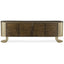 The Prime Time Media Cabinet from House of Isabella is a truly unique and luxurious piece of furniture. Handpicked for its uncompromising style, this credenza is destined to become the focal point of any room. The doors are crafted from radial matched Paldao veneers, creating an unforgettable and stylish look. The metal frame and curved ends feature a stunning Golden Blonde Leaf finish, while the top is finished in rich Galway. Behind the centre doors, you'll find an adjustable shelf, providing both functionality and beauty. The interior behind the flat doors is finished in Chocolate Spice, adding even more character to this already stunning piece. With dimensions of 233.7 x 45.7 x 76.2, this media cabinet is sure to make a statement in any space.