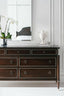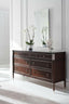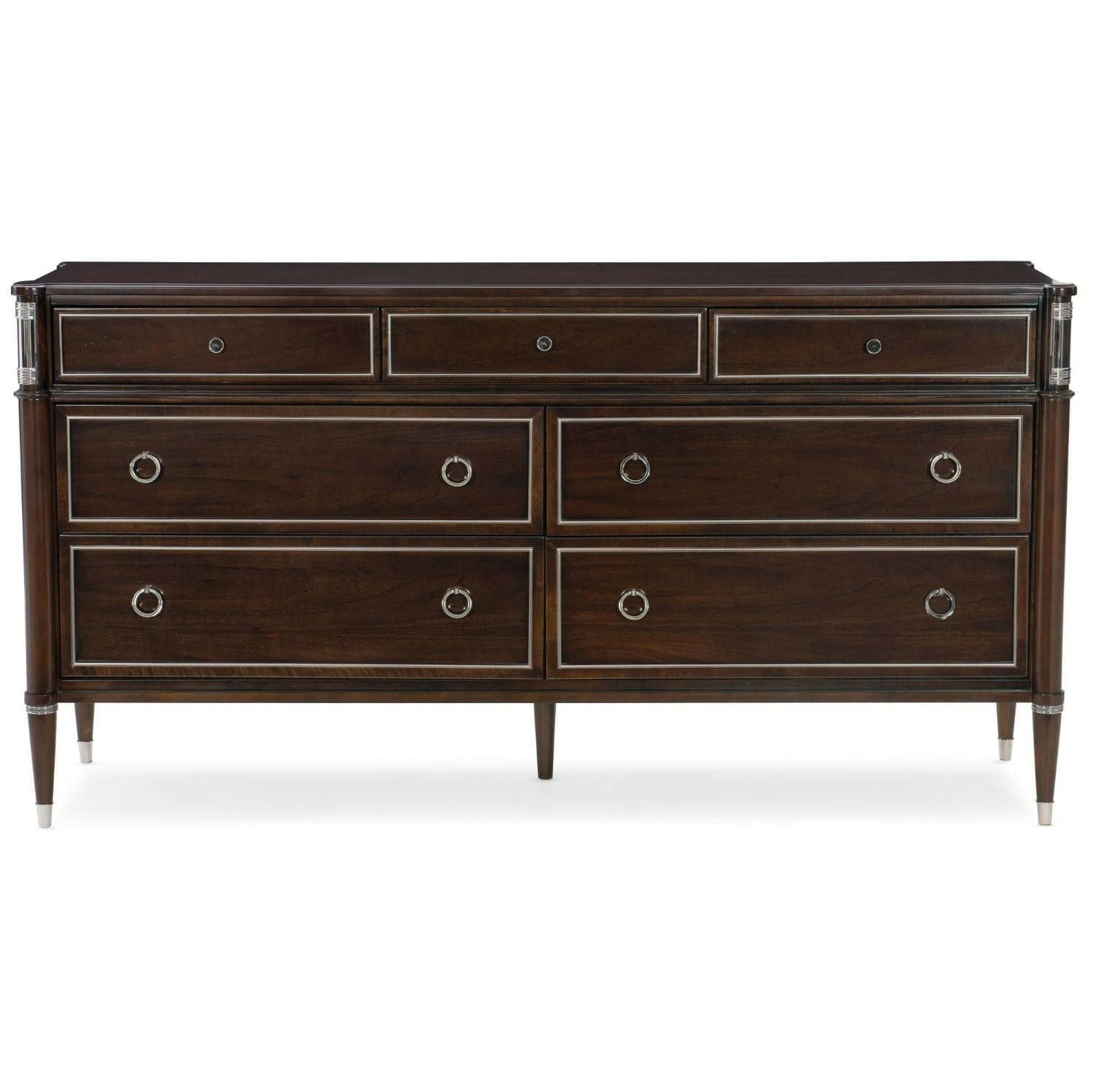 A breath of fresh style when it comes to storage pieces, this exceptional dresser expertly combines form and function. Its rich Mocha Walnut finish is accentuated with trim and accents glinting in a Soft Silver Paint finish. Seven drawers provide ample room for wardrobe essentials while its sophisticated presence adds character to a bedroom. Plus, each of its top drawers is distinguished by an interior finished with an elegant silkscreen pattern for another touch of luxe. Case finished in Mocha Walnut and drawer trim in Soft Silver Paint. Metal collars in Stainless Steel. Seven drawers with soft close undermount guides. Top drawers bottoms with silkscreen pattern. Metal ferrules in Polished Stainless Steel Drawer interior in Soft Silver Paint.