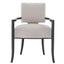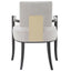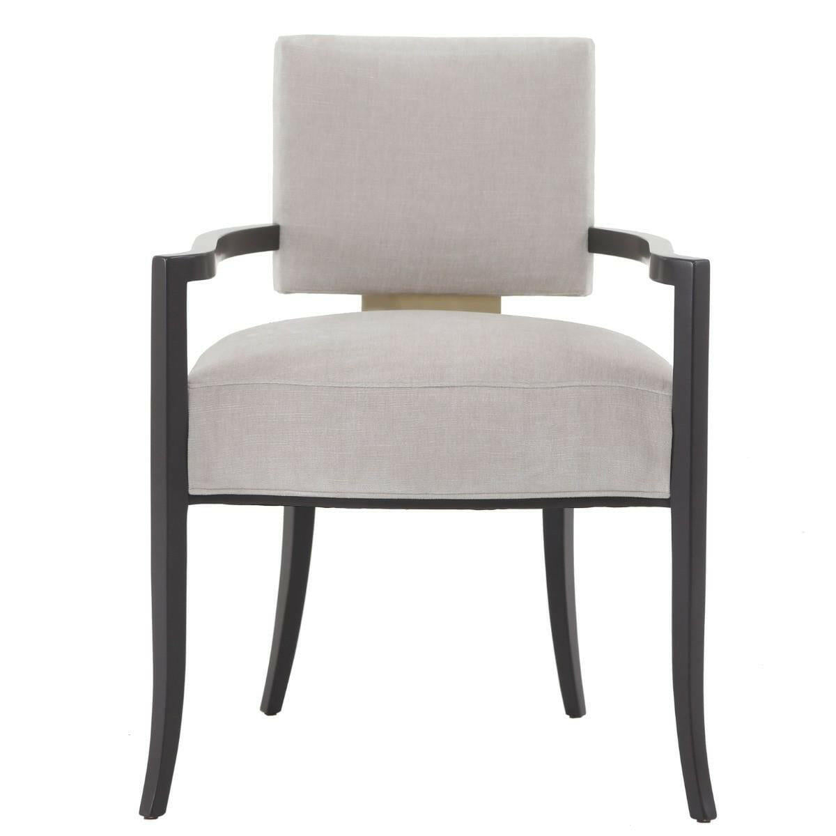 This contemporary arm chair takes on dramatic style when you view the wide, Whisper of Gold panel that shines off its back. Fabric surrounds the square upper back and seat cushion that rest on an exposed wood frame, sabre legs and gracefully curving arms finished in Seal Skin. This is a low, klismos chair with truly polished appeal.