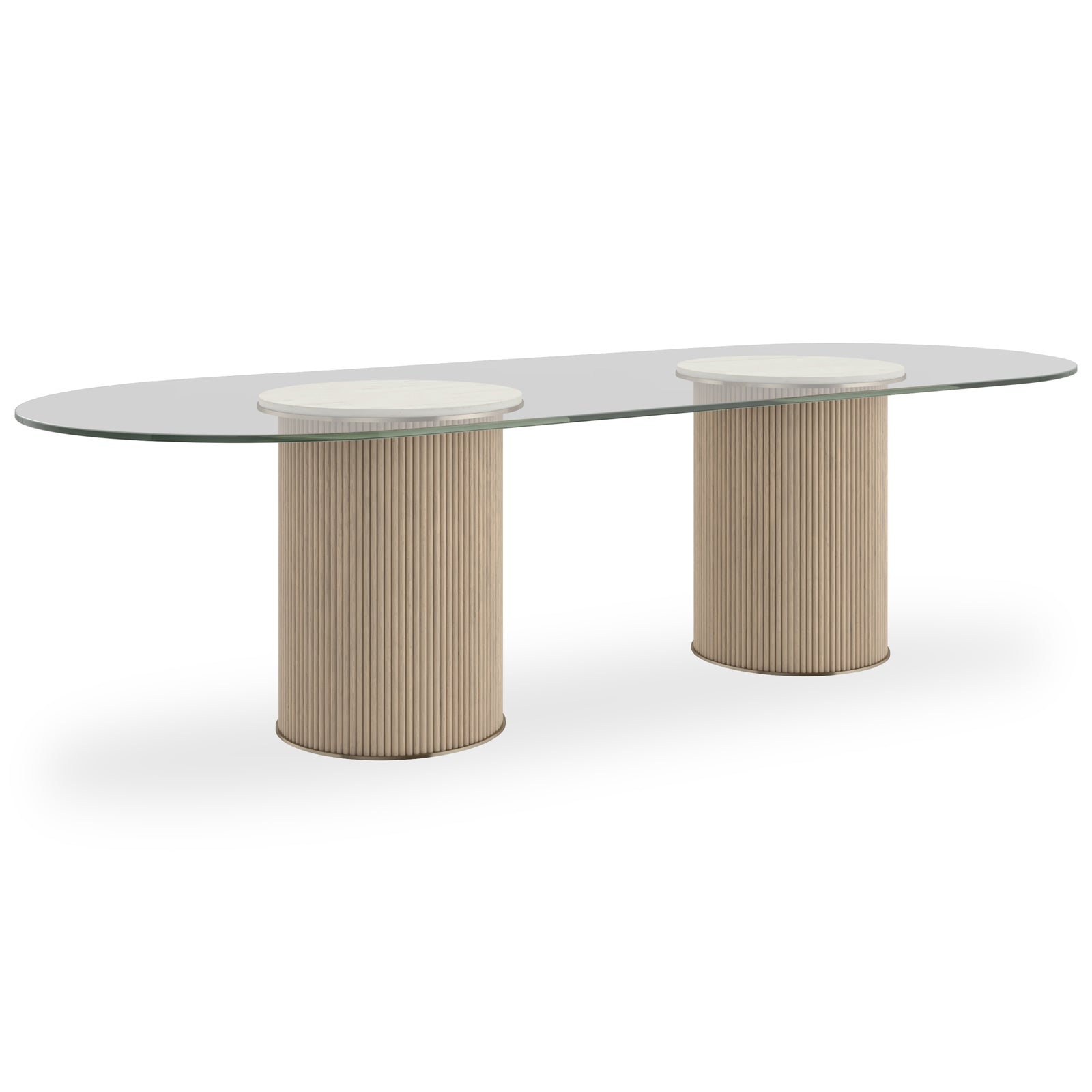 Rhythm Oval Glass Top Dining TableThis dining table combines a clear oval glass top with a reeded wood pedestal base finished in Sun Drenched Oak and Lucent Bronze Metallic trim, offering simple elegance and sophisticated design.FEATURES:Clear glass oval top with decorative plate.Two reeded wood pedestal bases in Sun Drenched Oak.Base trim and decorative plate in Lucent Bronze Metallic.Caracole ClassicTaking the classics of furniture design and pairing with unique materials and refined finishes, this portfolio was born of our vision to create high-style furniture with a personality of elegance and individuality. Bring a breath of fresh air to interiors with distinctive pieces for every room of the home, while blurring the lines between classical styling and modern taste. These playfully named pieces address whole room environments through an eclectic lifestyle approach, instilling a scheme with versatile furniture that are sophisticated, creative and classy in equal measure.
