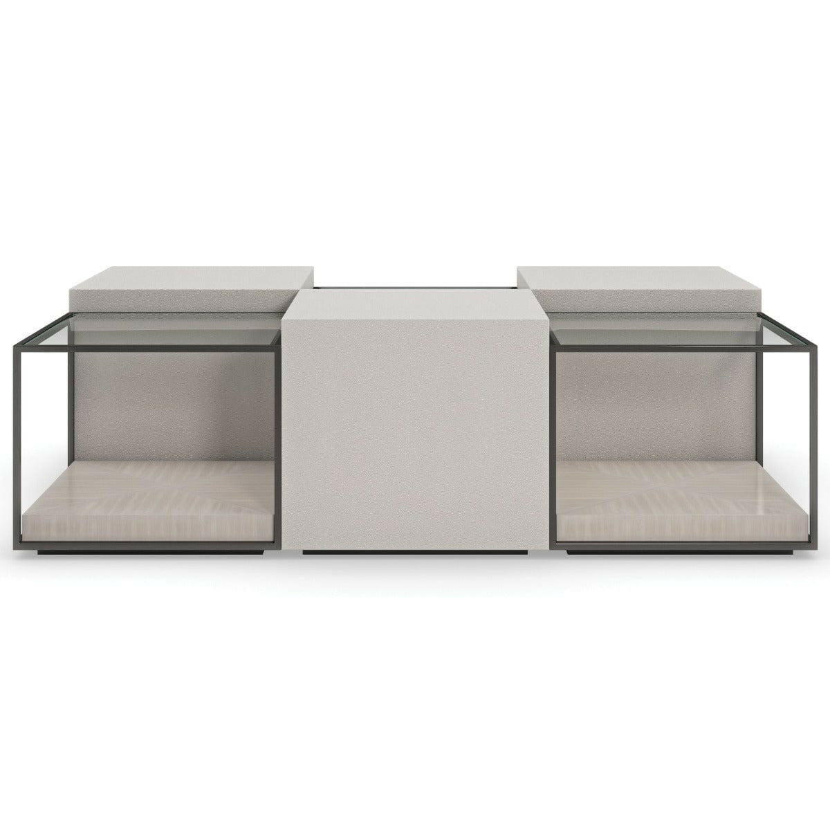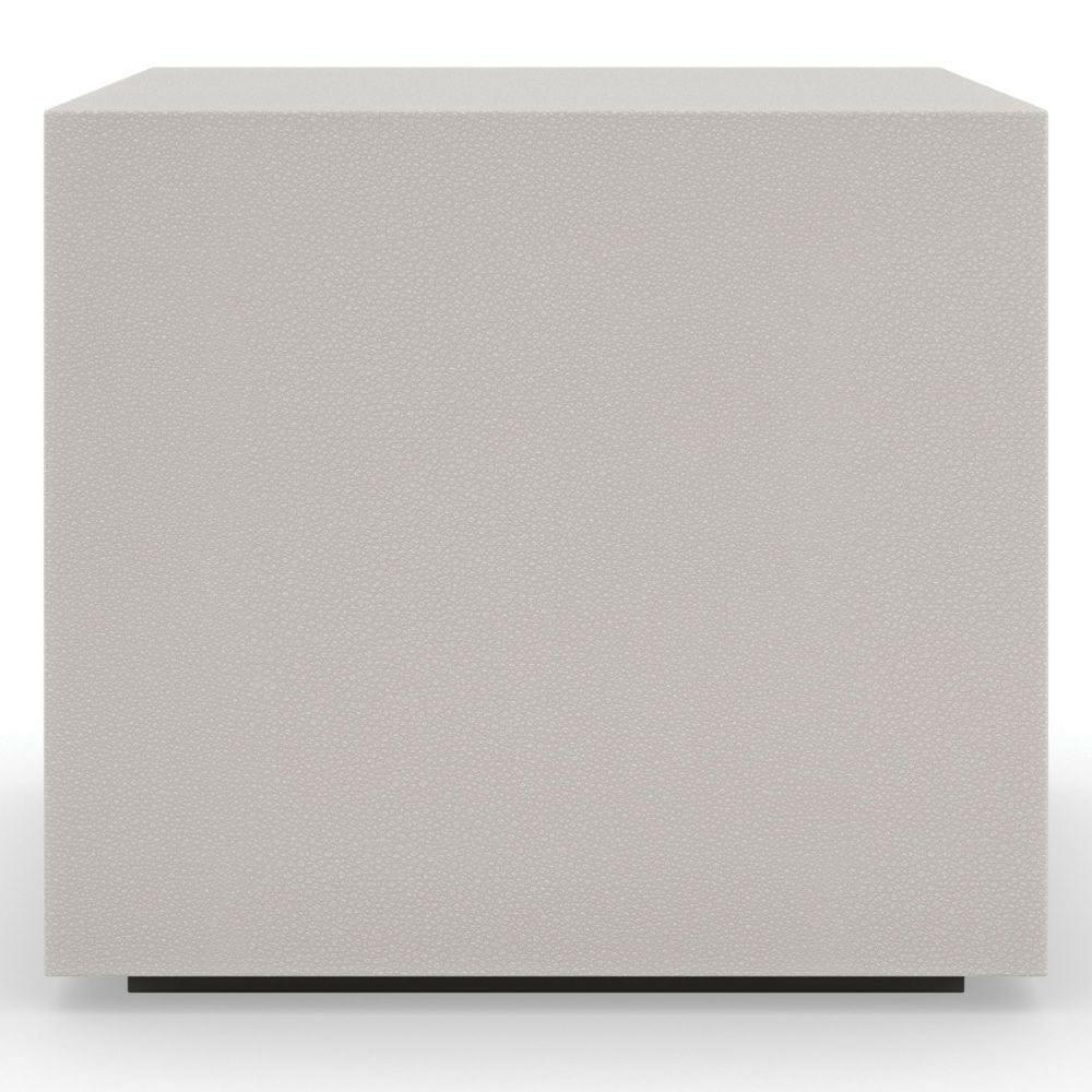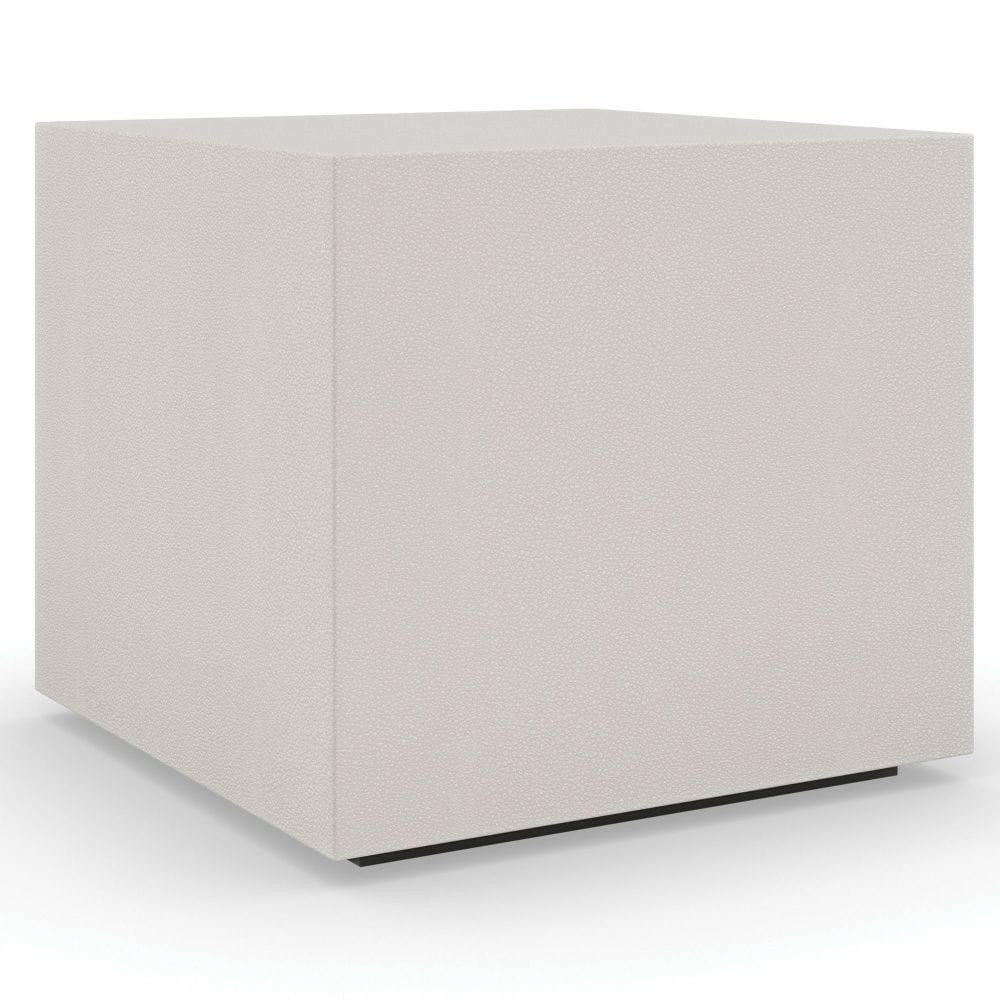 Styled in multiples or on its own, this refined cocktail table makes a solid statement in a richly textured faux shagreen. Fully wrapped, its classic cube shape appears to float on a recessed, wood plinth base in an Almost Black finish. Pair with our Open Air cocktail table and create a multi-dimensional, layered collection that reflects your style. Upholstered cocktail table. Base in Almost Black.