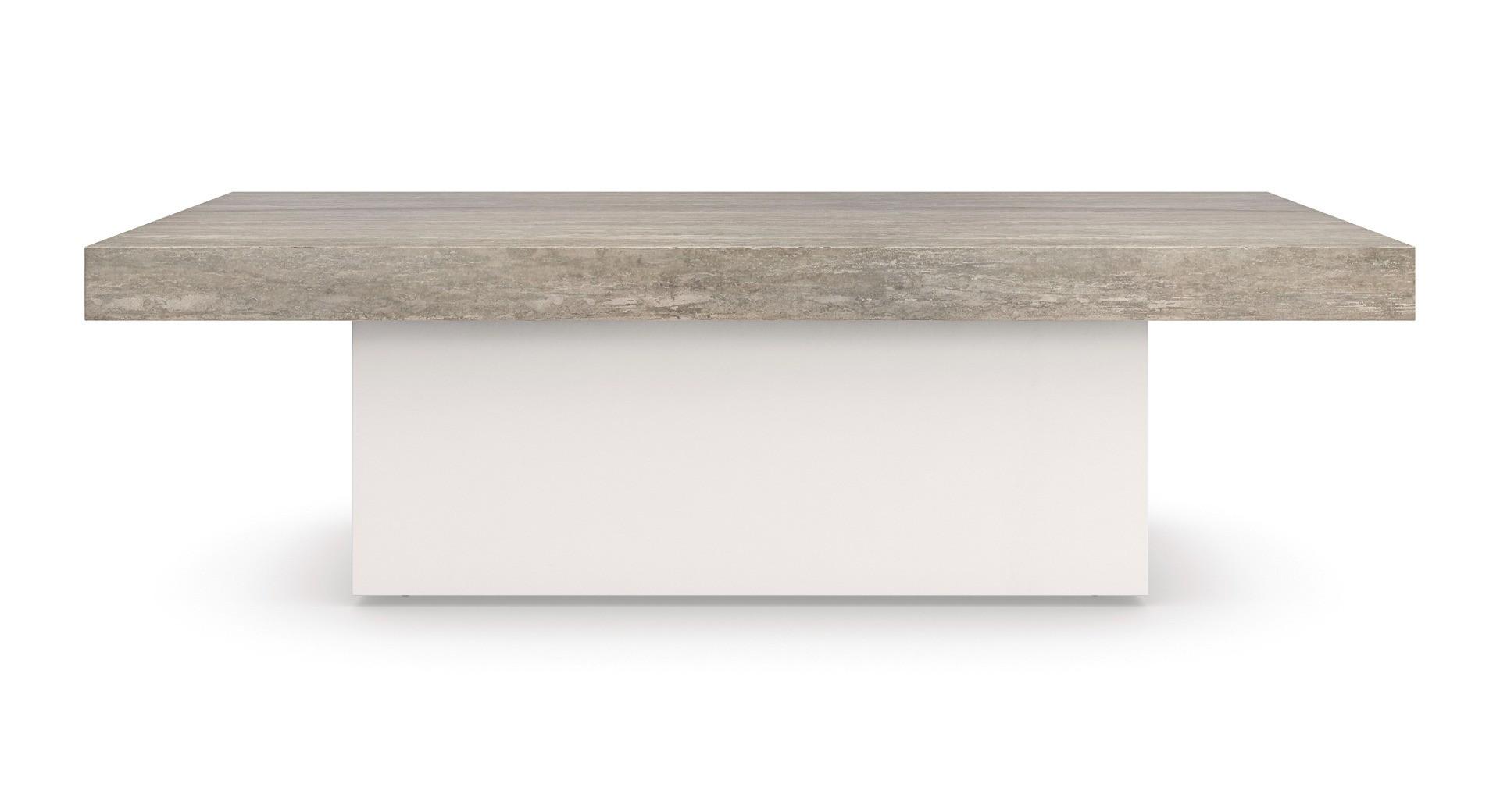 Architectural yet organic, this sleek cocktail table exhibits form and functionality in perfect unison. Its clean-lined modern form is both simple and alluring, with a Silver Travertine stone top and wide pillar base in a subtly textured adobe finish. A design staple, the Unity cocktail table is well-scaled to style on its own, or in pairs to counterbalance a sofa or sectional. Hidden casters make it easy to move. FEATURES: Silver Travertine stone top. Base finished in Textured Adobe. Hidden casters for mobility.