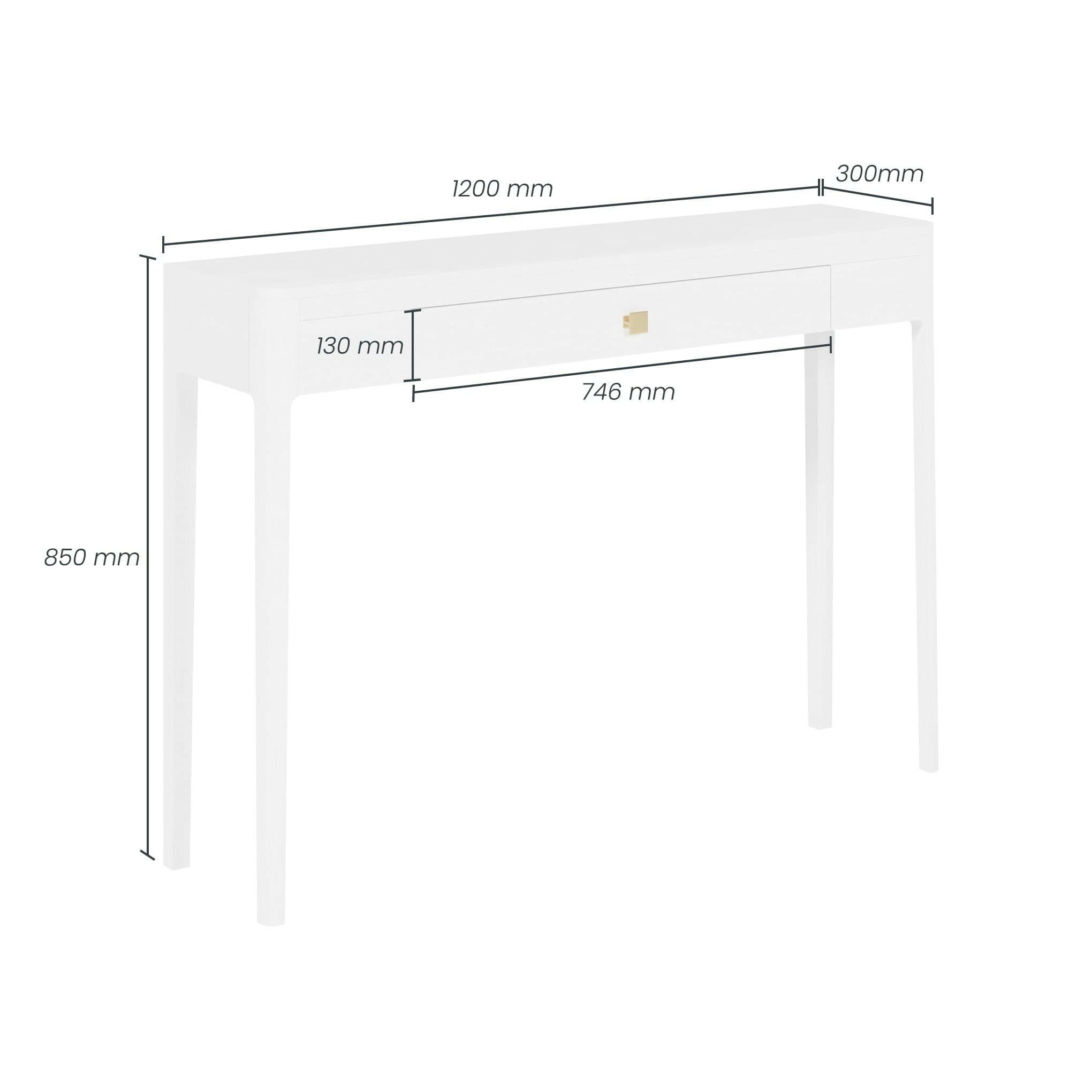 One drawer white console table in white stained solid oak and oak veneer, curved front, curved legs, cut lines, visible grain, metal runners on drawers and gold coloured square handle 120W x 30D x 85H cm; 15kg Please see attached care instructions
