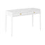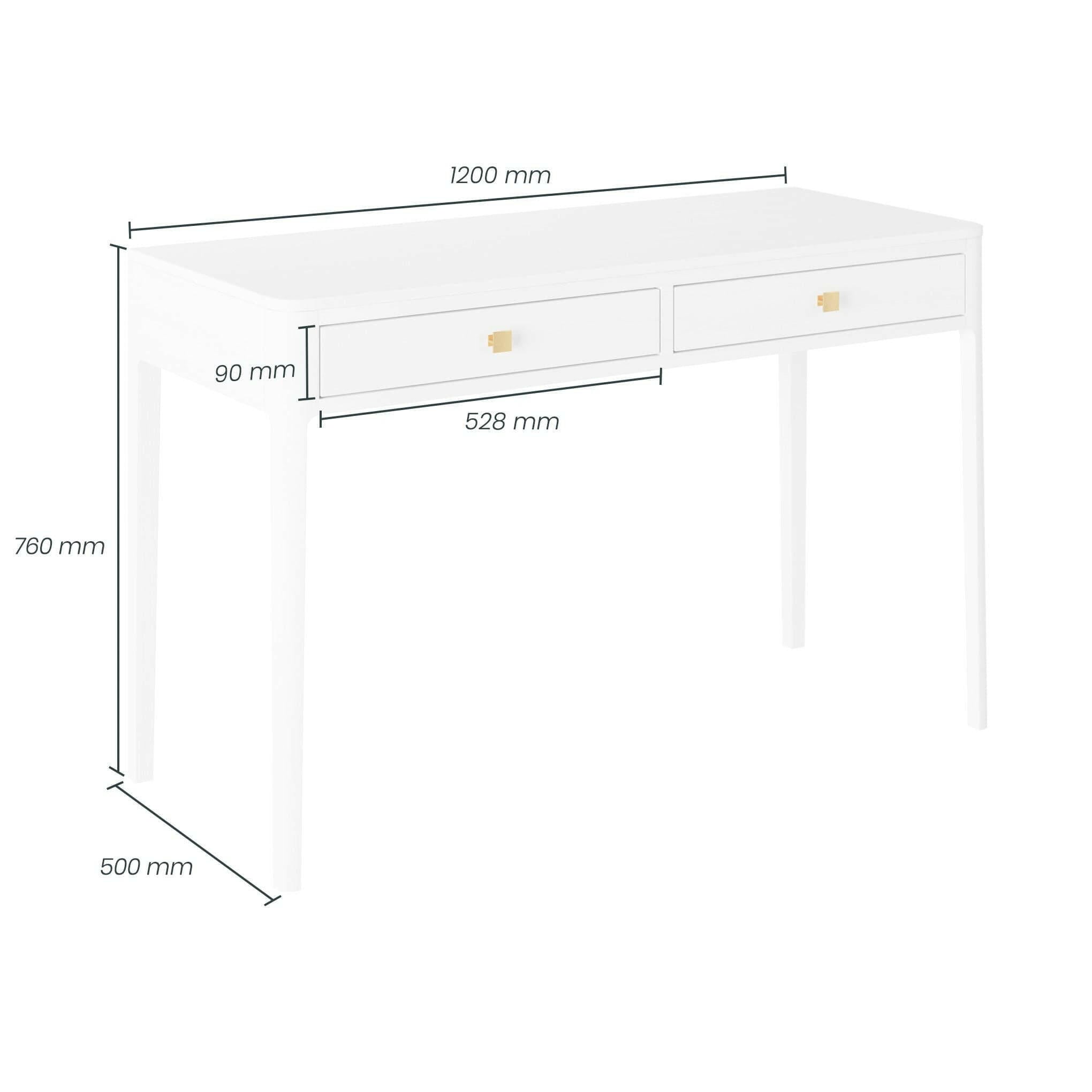 Two drawer desk in white stained solid oak and oak veneer, curved front, curved legs, cut lines, visible grain, metal runners on drawers, gold coloured square handles 120W x 50D x 76H cm; 15kg Please see attached care instructions. Gold draw knobs included.