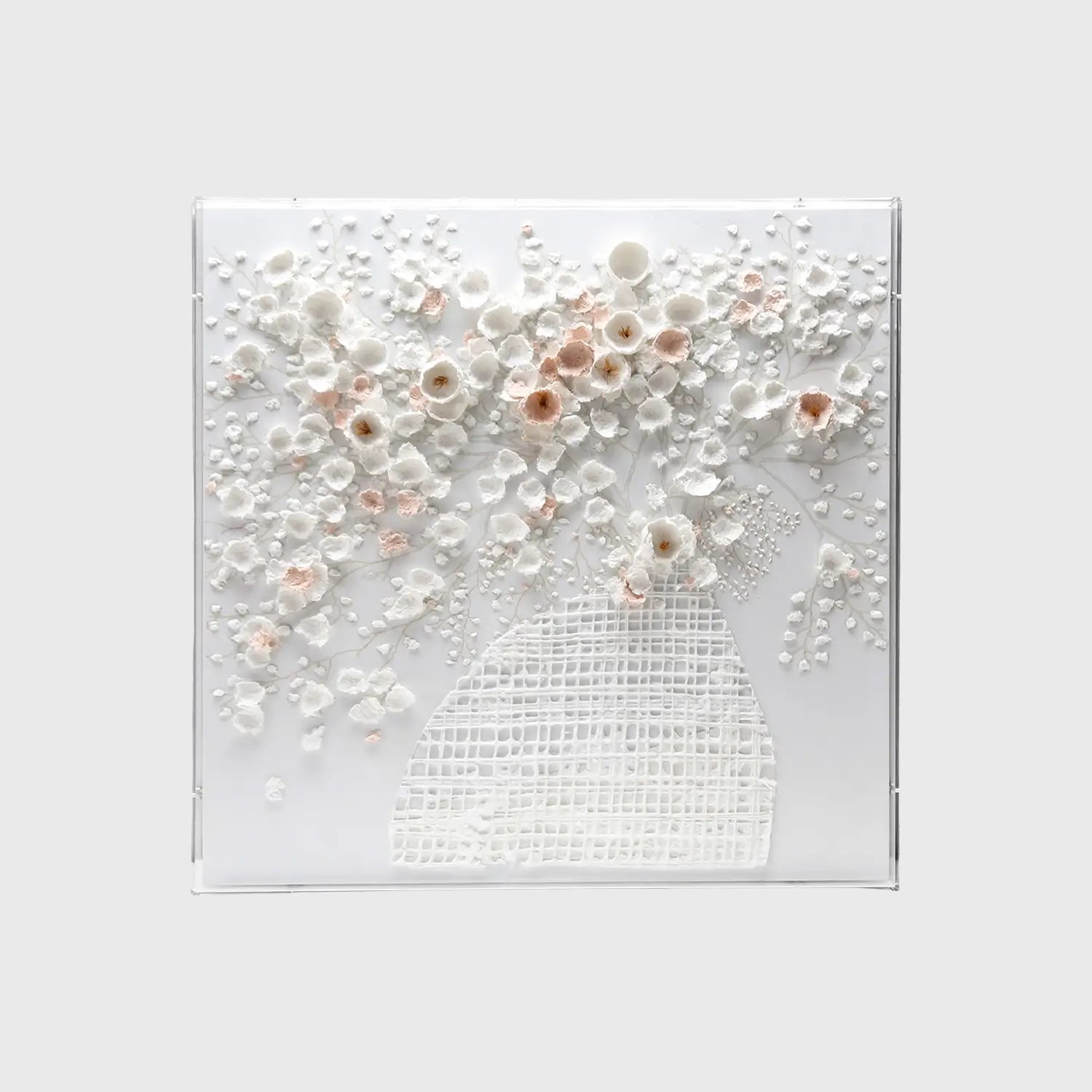Bring poetic elegance and sculptural beauty into your home with Bloomveil Handmade Dimensional Paper Wall Art 2 , an exquisite piece crafted entirely by hand using premium paper derived from mulberry trees . This artwork features a lush arrangement of delicate blossoms, textured petals, and subtle blush accents that seem to float effortlessly across the canvas. Every petal is shaped with intention, giving the piece remarkable depth, softness, and organic movement. The name “Bloomveil” was chosen to reflect the artwork’s ethereal composition— a veil of blooming flowers that drapes gently across the surface like a soft floral curtain. The layered arrangement creates the sense of flowers cascading through air, forming a translucent, dreamlike veil that adds serenity and elegance to any room. Mulberry-tree paper is used for its exceptional strength, texture, and natural fibers, making each handcrafted element durable yet feather-light. This eco-friendly material has been traditionally valued by artisans for centuries, contributing both authenticity and refined artistry to the final piece. Encased in a modern clear frame, Bloomveil Handmade Dimensional Paper Wall Art 2 , becomes a captivating focal point for living rooms, bedrooms, entryways, and luxury hospitality spaces. Its harmonious blend of dimensional design, subtle color accents, and delicate craftsmanship complements minimalist, contemporary, and nature-inspired interior styles. Elevate your décor with Bloomveil Handmade Dimensional Paper Wall Art 2 —a serene, sculptural veil of blossoms that transforms your space with beauty, texture, and timeless artistry.