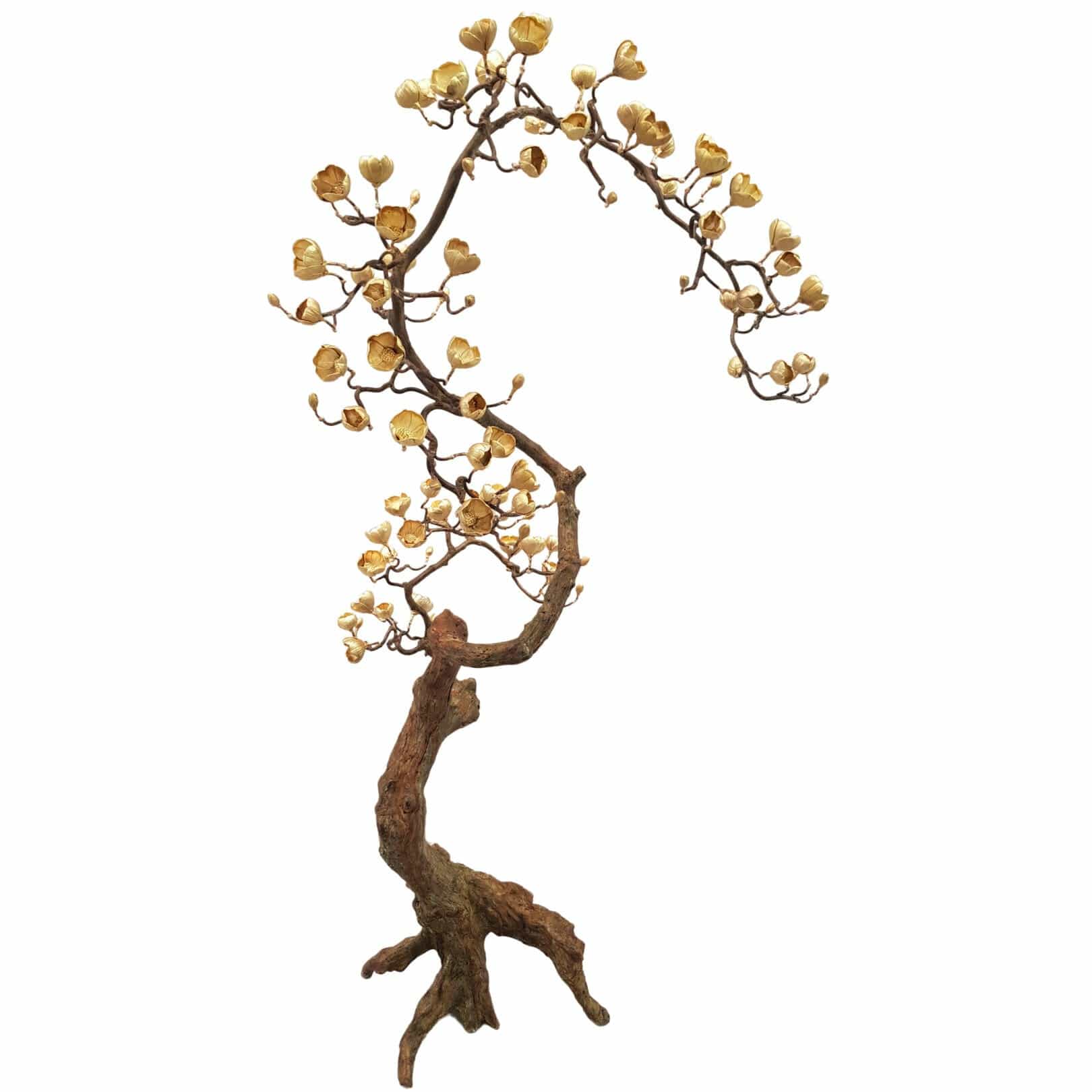 Introducing the Bronze Blossom Sculpture Large - an exquisite, hand-cast masterpiece that brings organic elegance and timeless artistry to any space. A true luxury bronze sculpture that commands attention and celebrates nature in metal form. Bronze Blossom Sculpture Large: Nature's Beauty in Bronze The Bronze Blossom Sculpture Large is a striking addition to our Original Bronze Sculpture Collection at Eccotrading Design London. Standing 160 cm tall with a 90 cm width, this commanding piece features hand-worked gilded flowers atop robust bronze branches. Expertly cast using the lost-wax technique, each petal and stem retains crisp detail and a rich, evolving patina, making every sculpture uniquely captivating. Artisanal Lost-Wax Casting & Gilded Flourish Crafted by master bronze artisans, the Bronze Blossom Sculpture Large begins as a detailed wax model, molded in clay, and fired to create a precise bronze casting. After the mold is removed, the surface is meticulously sanded, chased, and finished by hand. The delicate gilding on the blossoms introduces a luxurious contrast, elevating this piece into the realm of luxury bronze sculpture . Versatile Display & Pairing Perfect as a standalone statement or paired with one of our pedestals, the Bronze Blossom Sculpture Large enhances entryways, grand foyers, or feature walls. Choose from three oak pedestal shades or our pumice leather-topped bronze stands to create a tailored display that highlights the sculpture's grandeur and organic form. Key Features Dimensions: Height 160 cm × Width 90 cm × Depth 70 cm Material: Solid bronze with hand-applied gilded accents Technique: Traditional lost-wax casting for museum-quality detail Edition: Limited production for exclusivity Care: Wipe with a soft cloth; patina will deepen gracefully Elevate Your Interior Integrate this dramatic sculpture into luxury hotels, corporate lobbies, or sophisticated residences. The Bronze Blossom Sculpture Large not only adds a touch of botanical grace but also stands as a powerful conversation piece, epitomizing the marriage of art and metalwork.