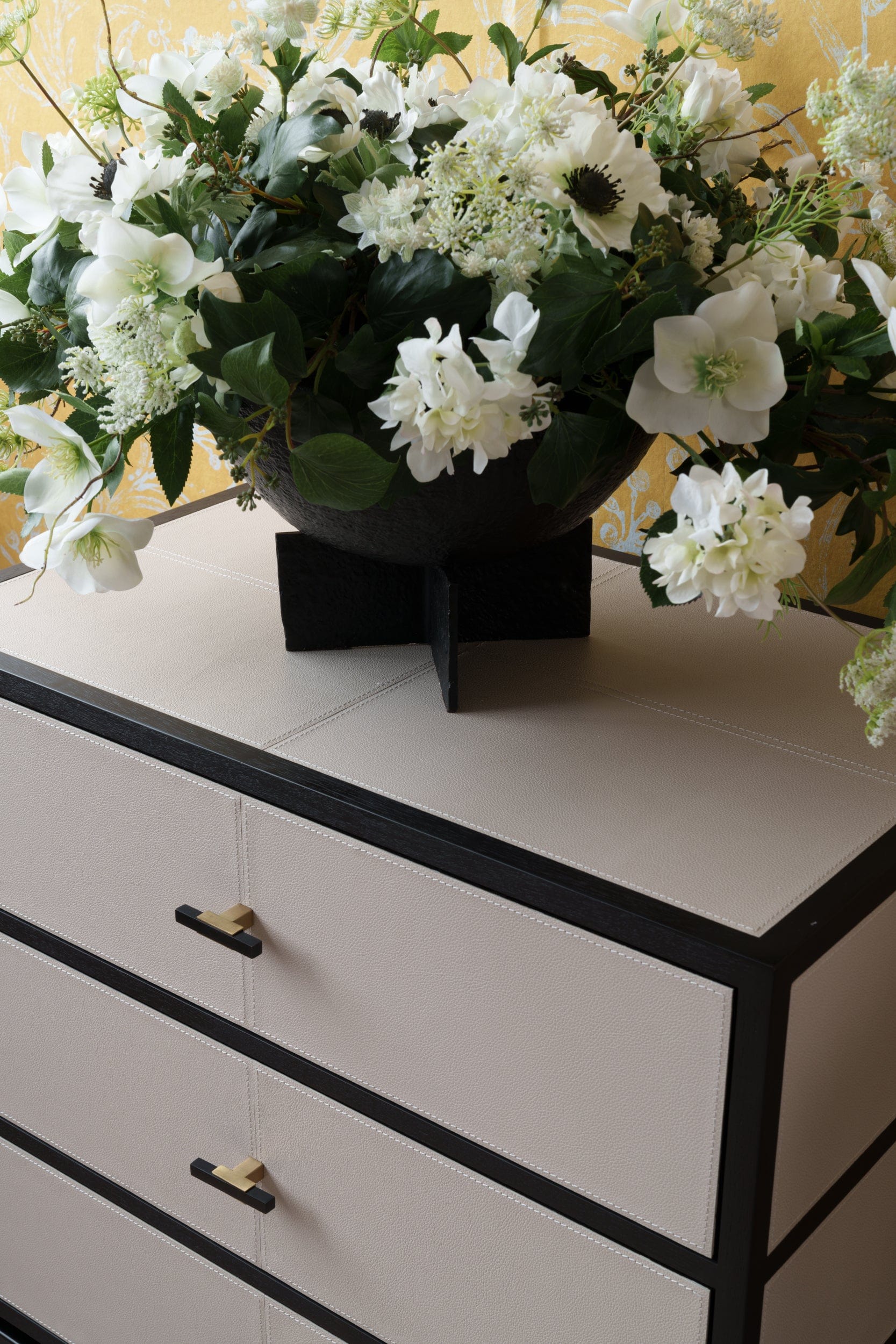 Bronze Brutalist Flower Bowl: A Synthesis of Art and Function The Essence of Brutalism Crafted with meticulous attention to detail, the Bronze Brutalist Flower Bowl features a robust and textured surface that captures the essence of Brutalist architecture. The uneven, tactile finish not only enhances its visual depth but also reflects light in a way that is dynamically engaging. Complemented by a naturally arranged, delicate combination of Anemone, Hydrangea, Astrantia, Hellebore, Queen Anne's Lace, Ivy and twig. A Canvas of Contrasts The vase's dark, moody bronze is juxtaposed with a delicate arrangement of faux flowers, creating a dramatic contrast. These flowers, ranging from stark white to deep greens, simulate the softness of nature against the hardness of metal, offering a visual and textural feast for the eyes. Functional Artistry Despite its bold design, this flower bowl remains highly functional, suitable for a variety of floral arrangements, adding versatility to its aesthetic appeal. Timeless Appeal The Bronze Brutalist Flower Bowl is designed to be timeless. Its style complements both contemporary and traditional decors, fitting seamlessly into minimalist spaces or as a standout piece in more ornate settings. Its durability ensures that it can be a centerpiece for generations, aging gracefully and gaining character over time. Stylistic Versatility Ideal for any setting, the Bronze Brutalist Flower Bowl makes a statement whether placed in a corporate boardroom or a sophisticated living room. It's not just a decor item but a piece that defines a space, crafted to provoke thought and admiration. Sustainable Beauty In line with modern sustainability practices, the materials used in the Bronze Brutalist Flower Bowl are sourced responsibly. This commitment to the environment ensures that each piece is not only beautiful but also contributes to a sustainable future. Bronze Brutalist Flower Bowl: A Signature Piece The Bronze Brutalist Flower Bowl is more than just a functional item; it is a signature piece that captures the imagination. It invites viewers to explore the interplay between industrial strength and natural beauty, making it an essential addition to any collection of exclusive designer furniture. Whether as a gift to a discerning collector or as an addition to your own home, this flower bowl stands as a testament to innovative design and exquisite craftsmanship. Let the Bronze Brutalist Flower Bowl transform your space and showcase your taste for the uniquely beautiful. Bronze Brutalist Flower Bowl You can also check our Bertie 3 drawer chest