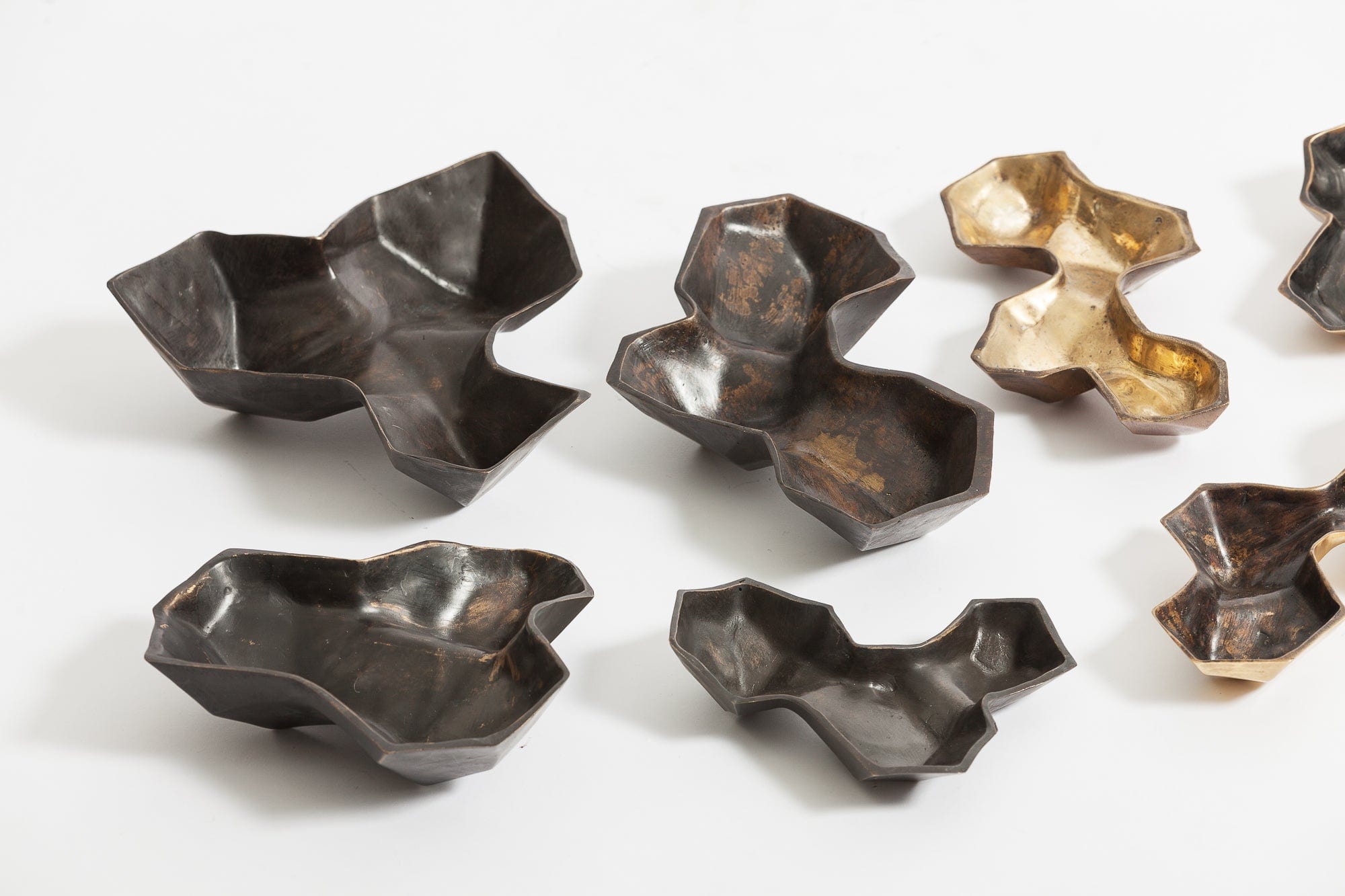Introducing the Bronze Geometric Vessels 7pc, a unique and luxurious addition to any interior. Made by Ecco Trading Design London, these vessels are a true testament to their commitment to sophisticated and visually exciting designs. Each set of 7 vessels is cast in bronze, showcasing a variety of patinated and polished surfaces with superb details. Please note that there may be some variation in the sets supplied, making each piece truly one-of-a-kind.